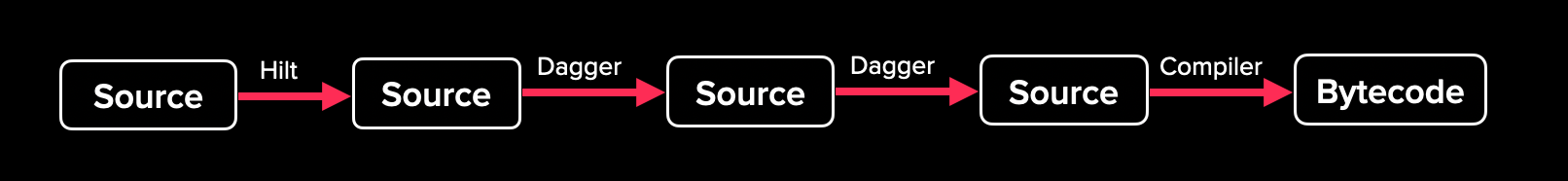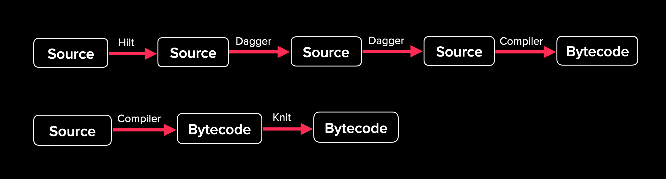 Instead of generating source code that must be re-processed and re-compiled, Knit works after the compilation is complete. It scans the compiled bytecode for its simple annotations, understands the dependency graph, and then modifies the bytecode directly to inject the necessary logic.