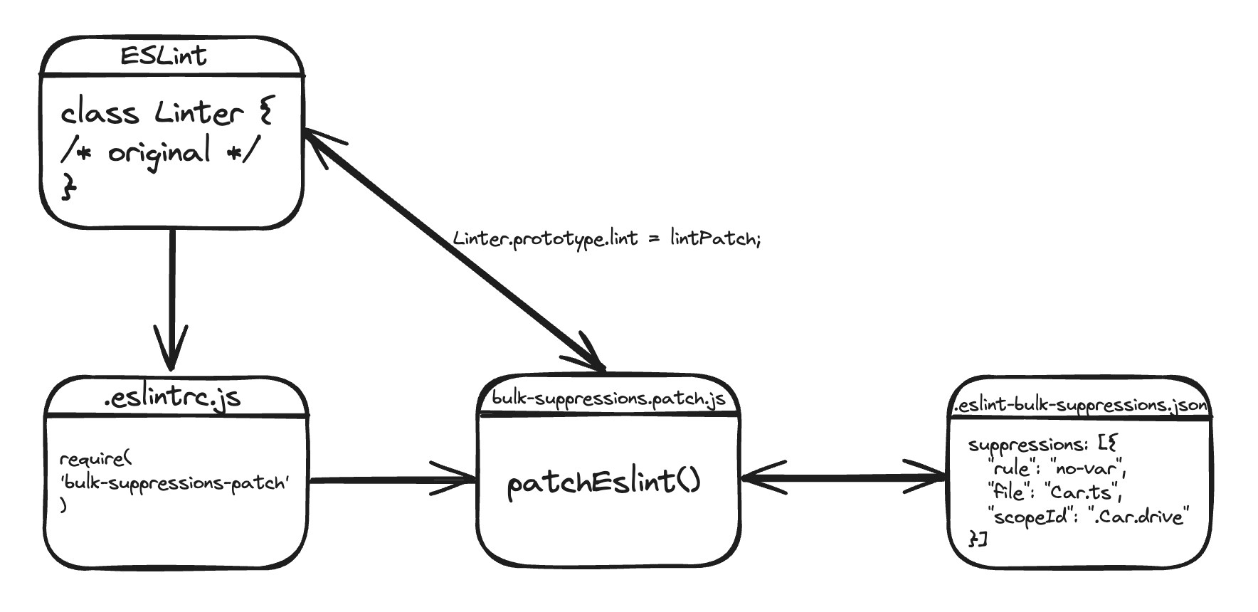 Due to its prominence, official ESLint contributions involve an RFC process and extended collaboration which seemed daunting for an untested prototype. We considered forking ESLint, but this could have hindered adoption — users may hesitate to switch to an unofficial NPM package. A fork also brings ongoing maintenance costs to stay current with the upstream project. Instead, we chose initially to contribute our feature to Rush Stack's @rushstack/eslint-patch, which we were already using at Tiktok. Instead of patching source files, it works by modifying the ESLint software in memory at runtime, a technique called "monkey patching." For JavaScript, this means overwriting object prototypes, which, in this case happens when ESLint evaluates the require("@rushstack/eslint-patch/eslint-bulk-suppressions"); statement while reading the .eslintrc.js file.