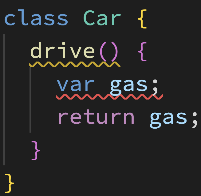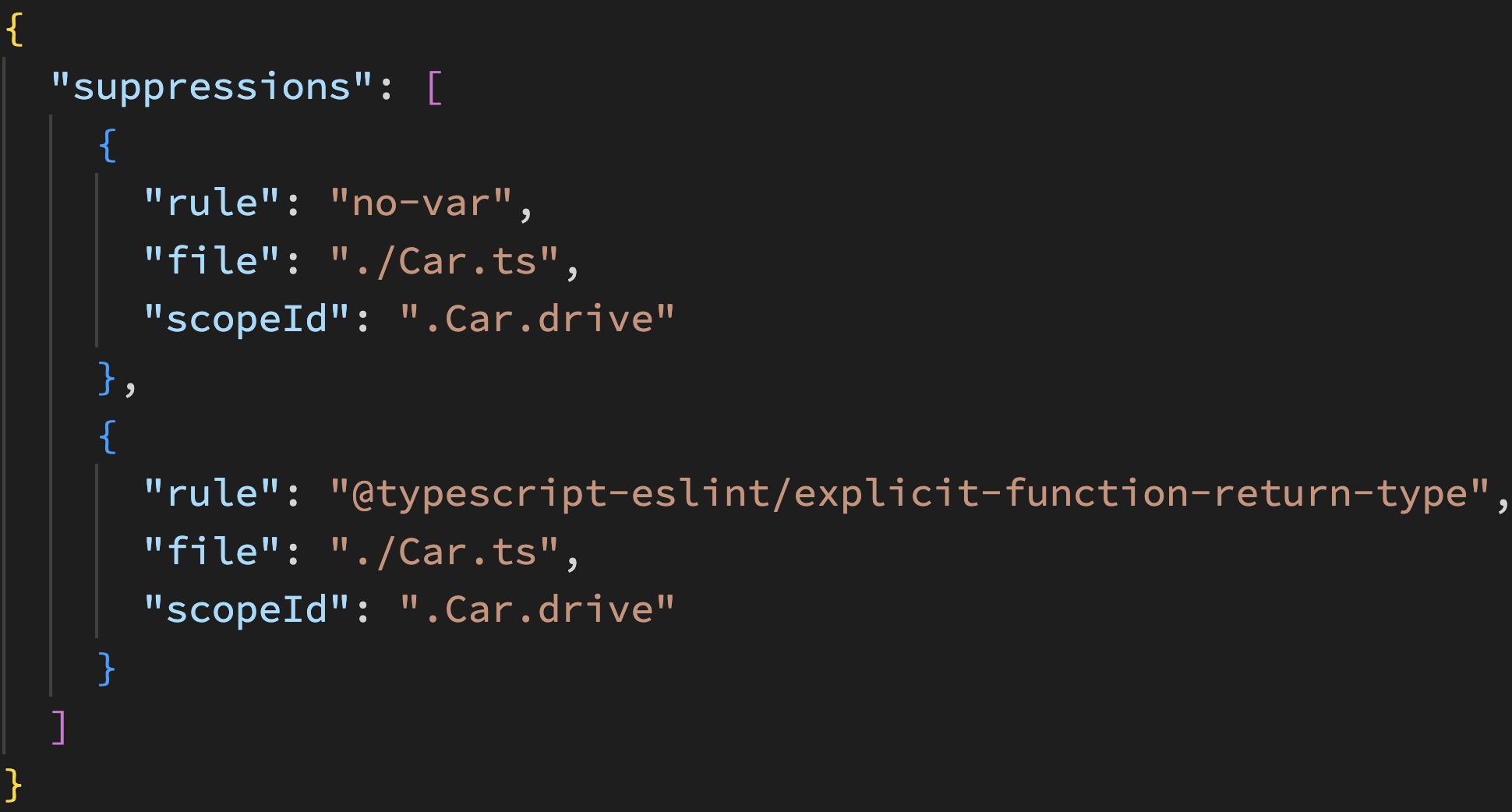 For a concrete example, consider a class Car with method drive() that violates some ESLint rules. Let's say the gas variable uses the deprecated var instead of const, which violates the no-var rule. Also suppose the drive() function's return value relies on type inference (which is appealing for casual projects but problematic in a large shared codebase). This violates the explicit-function-return-type rule. The scopeId notation identifies this region using the string ".Car.drive":