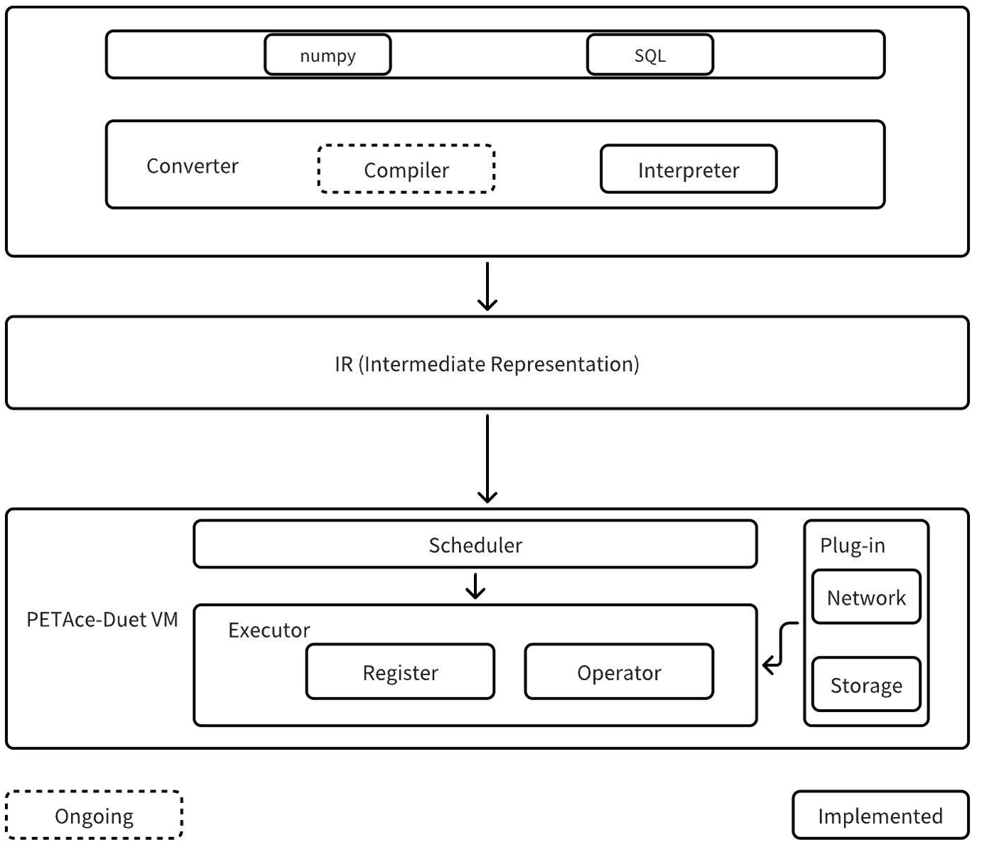 PETAce provides the architecture of the compiler, intermediate representation (IR), and virtual machine to support an interface similar to Numpy, reducing the cost of user code migration.