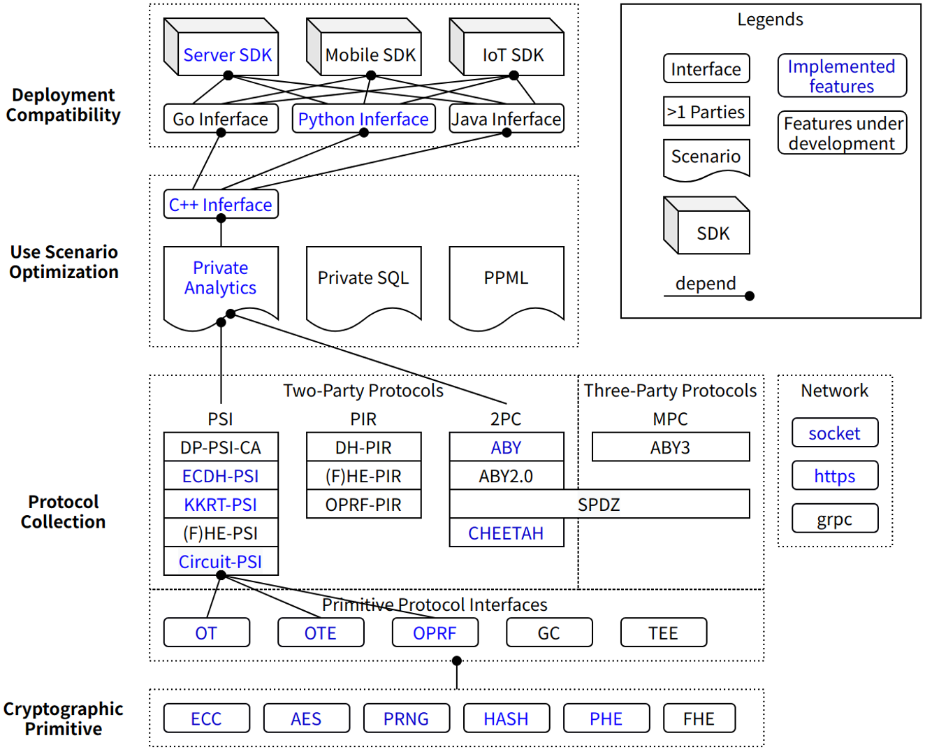 - PETAce provides various fundamental cryptographic protocols, such that it is flexible for users to build their own PET applications.