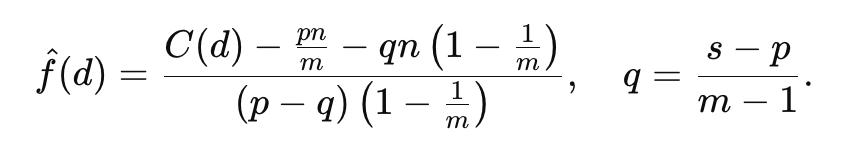 C(d) += M[i][hash(i, d)]An unbiased estimator for estimating the numbers of occurring is