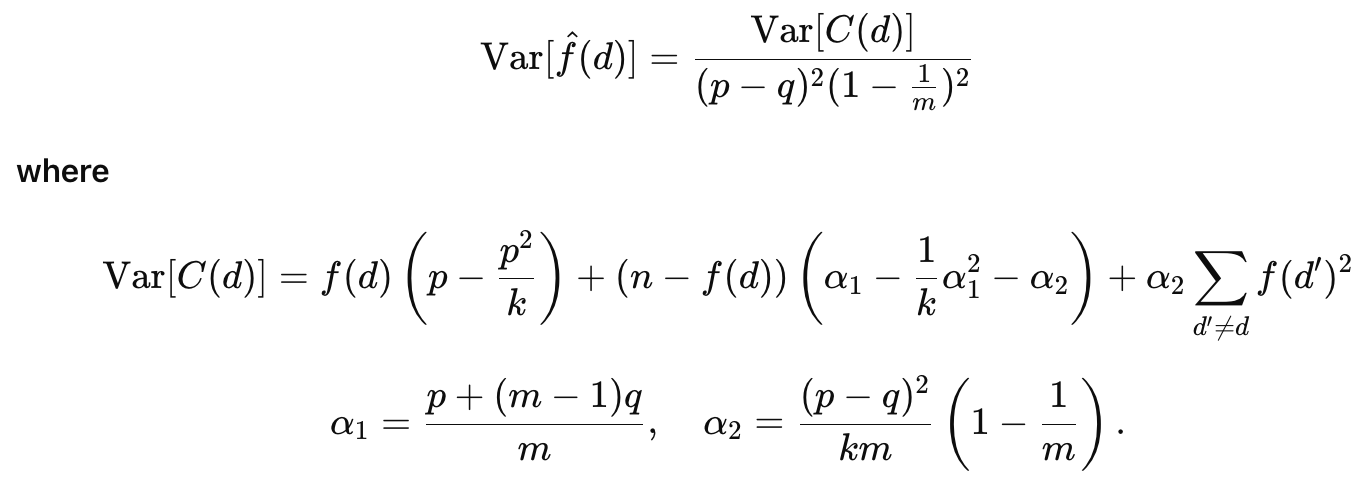 The server first decrypts messages with the secret key. Then, the server-side algorithm constructs a sketch matrix, in which the rows are indexed by hash functions, and each row i is the sum of the privatized vector of clients who selected the i-th hash function. To estimate the frequency of a message d, the server calculates all the hashed values of d, and then aggregates the total count from the sketch matrix M to get C(d):