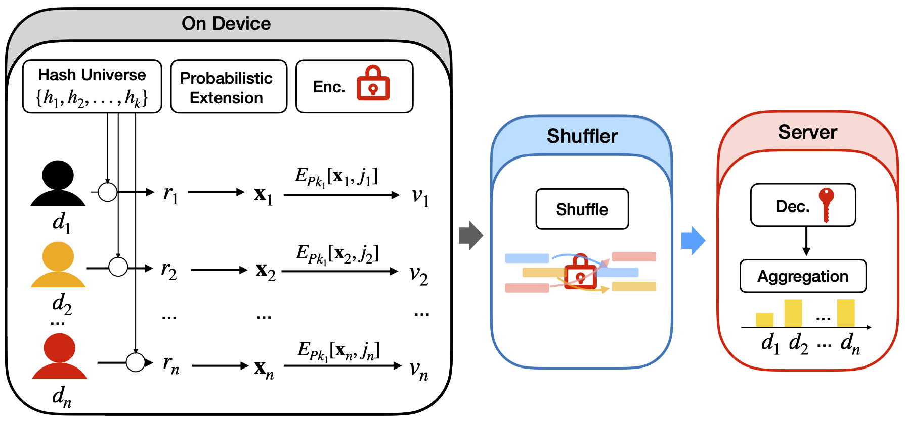 - The encrypted privatized data is then transmitted through an end-to-end encrypted channel and received by the shuffler. The shuffler then forwards the data to the server after a random shuffling operation.