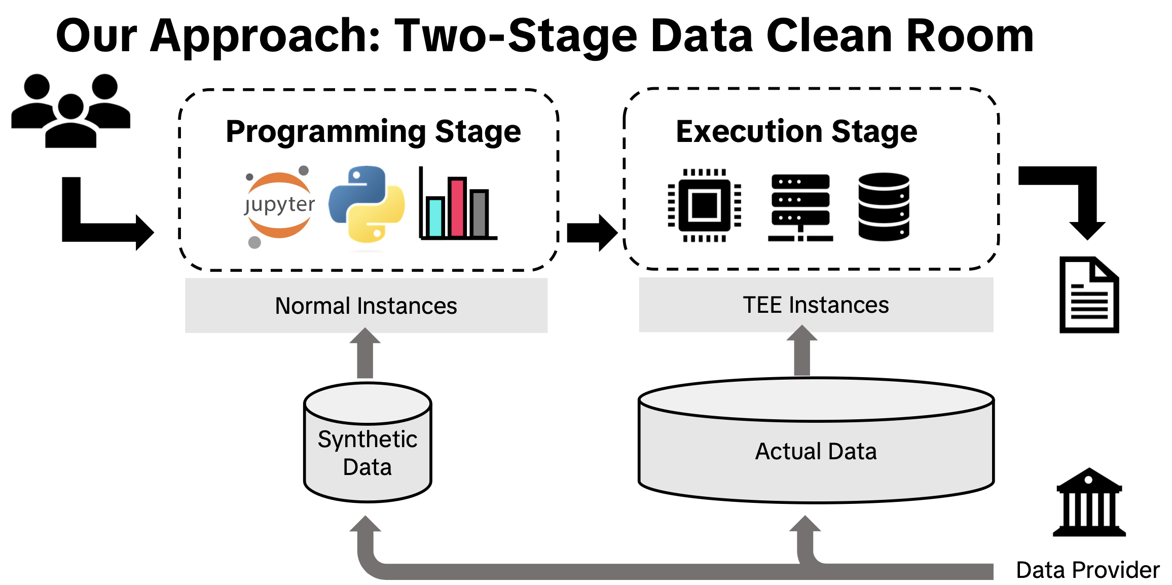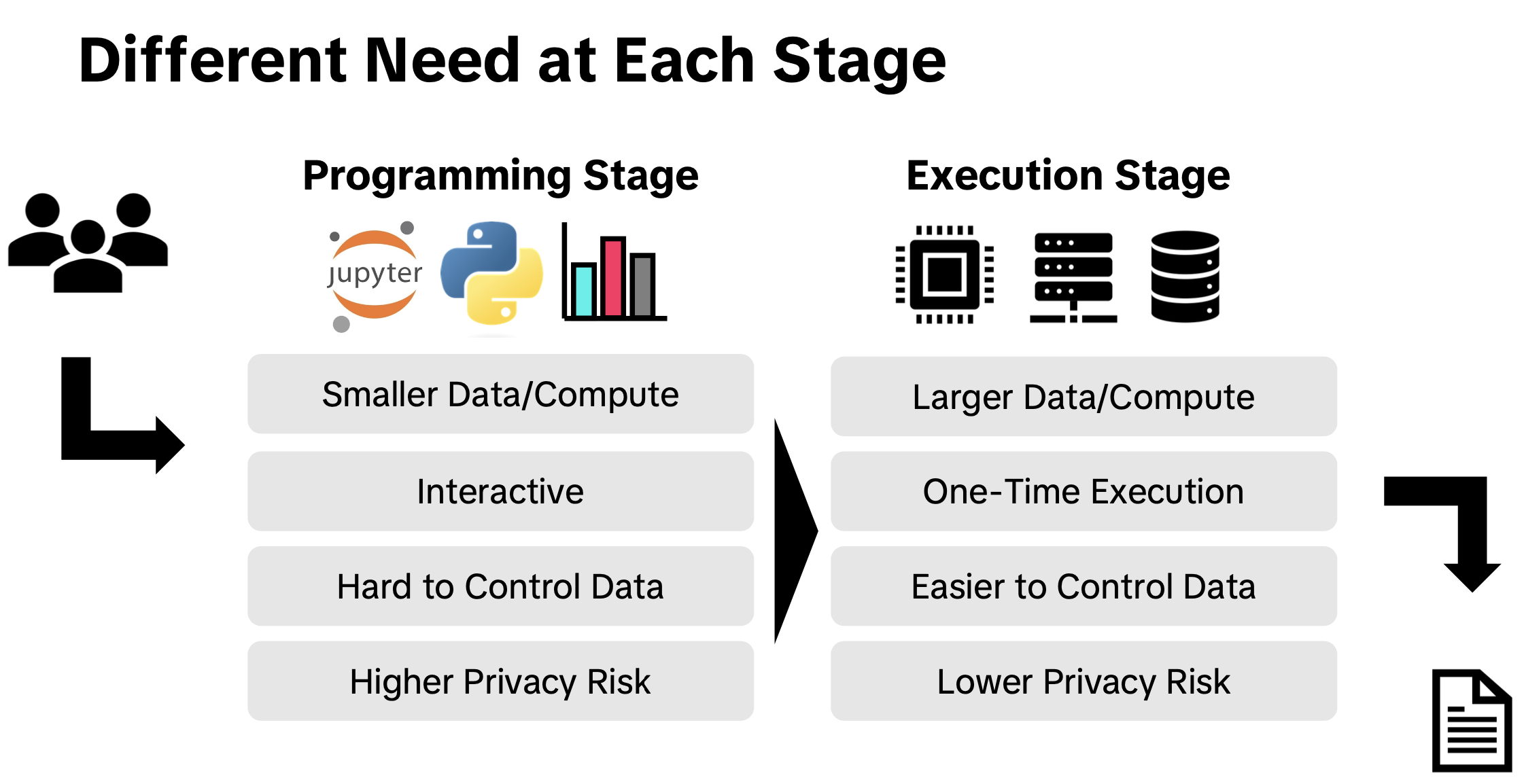 - Programming Stage: The data scientist uses Jupyter Notebook interface to explore the general data structure and statistical characteristics. The data providers can determine how they protect privacy of their data. For example, they can use differentially-private synthetic data, completely random data, or partial public data. This mathematically limits the leakage of individual data records. The finished notebook files can then be submitted to the Secure Execution Stage.