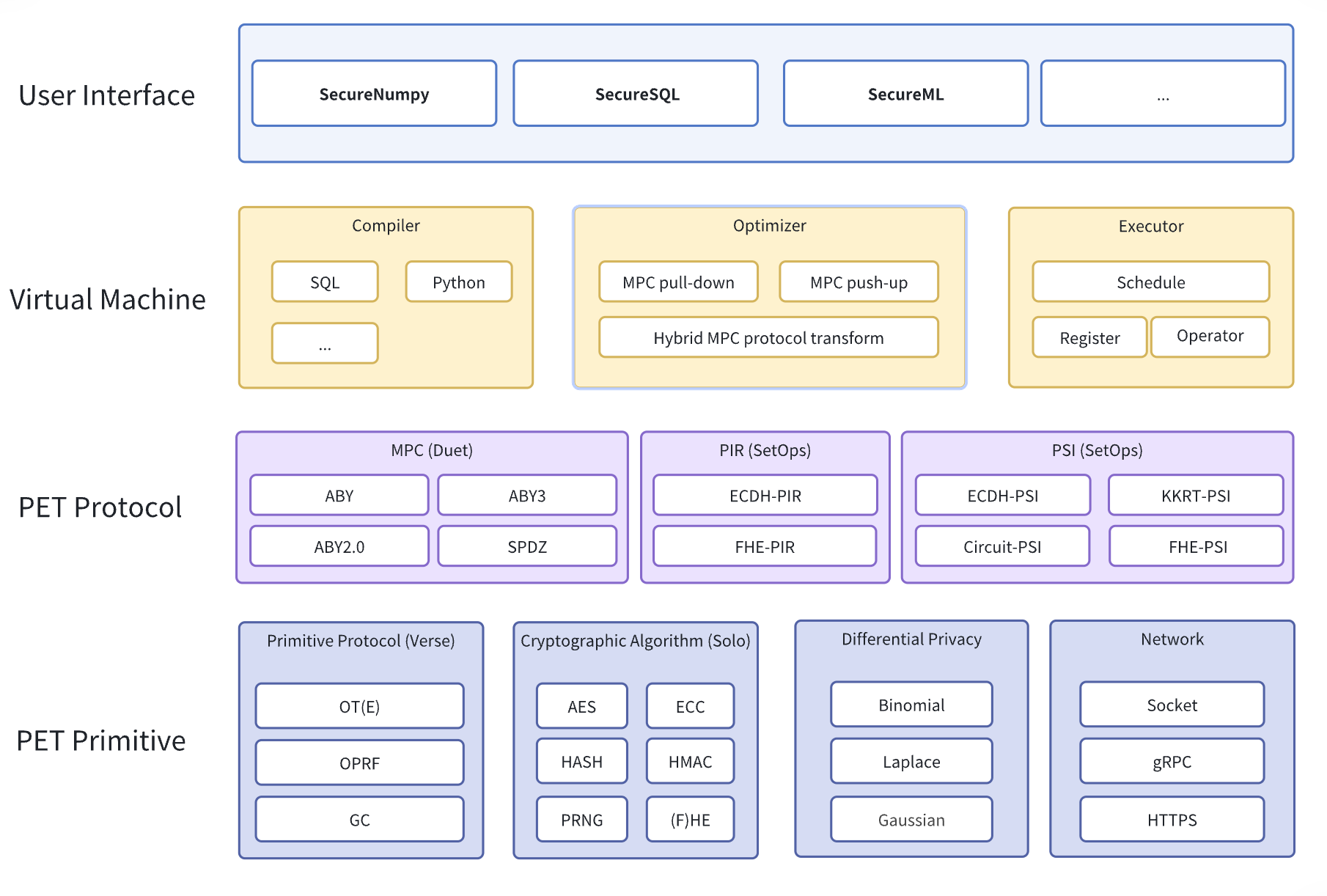 - The protocol layer includes secure multi-party computation protocols, such as general two-party secure computation protocols, privacy set intersection, privacy information retrieval, and more.