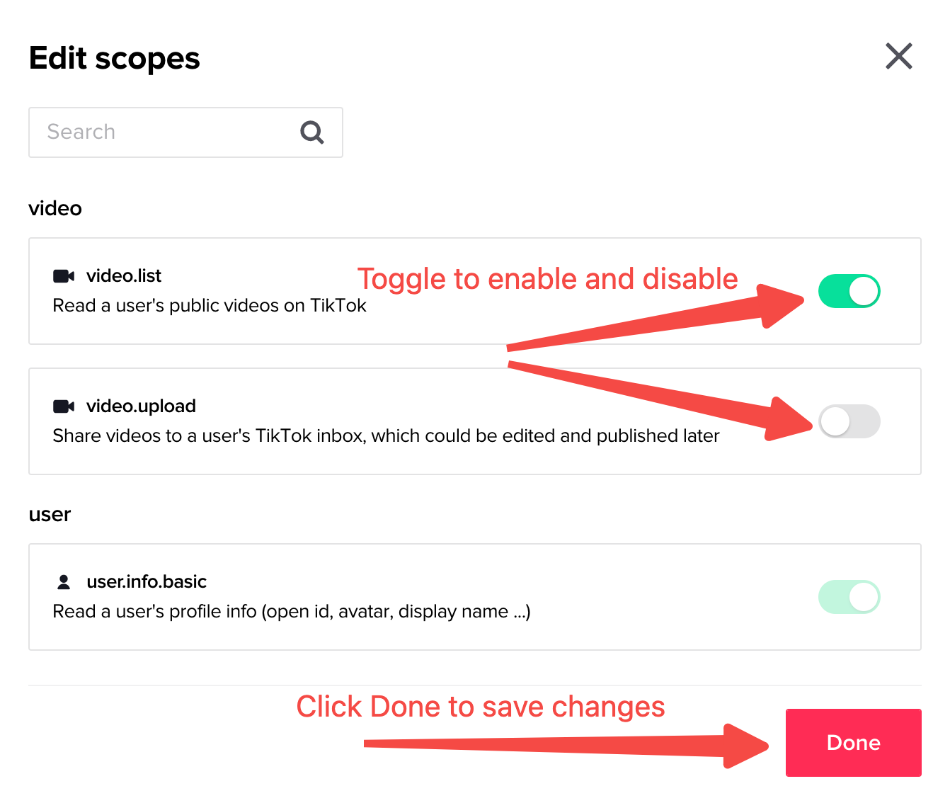 The user.info.basic scope can't be used to get all the fields in the table above. If your app uses any of these fields, your API client needs to send the right scope associated with the fields as shown in the following steps. Going forward, the user.info.basic scope can only retrieve "open_id", "union_id", "avatar_url", "avatar_url_100", "avatar_large_url" and "display_name".