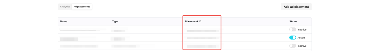 Note: Ad placements are inactive by default and must be switched to Active to be used.