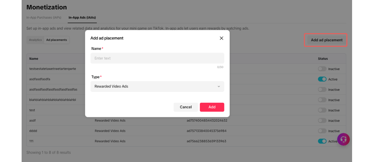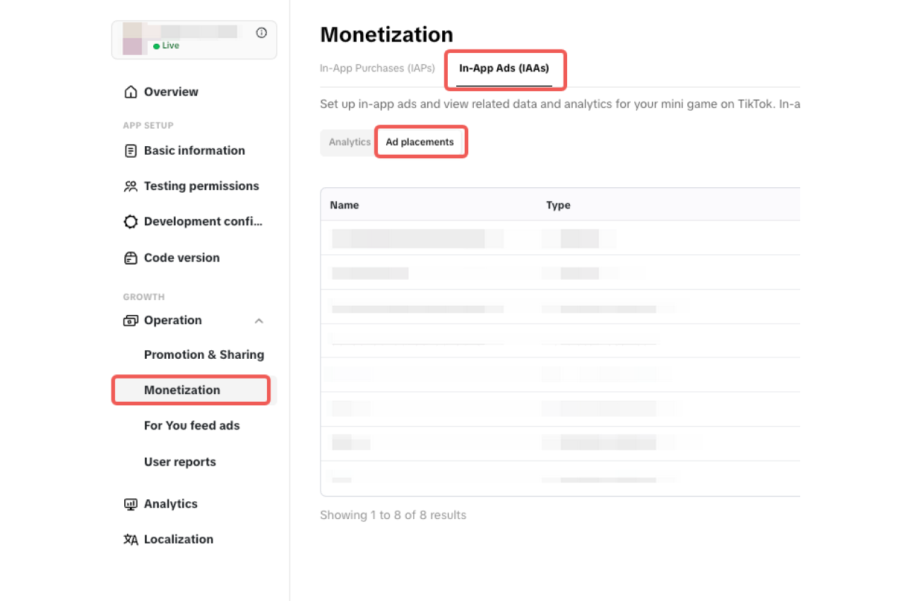 Before you start integrating with TikTok's JavaScript APIs for IAAs, you must first add ad placements on your mini game's app page.