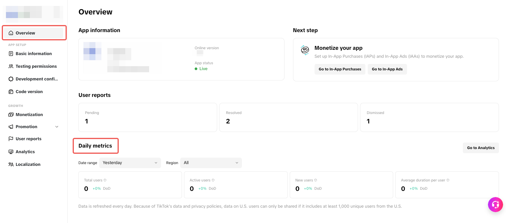This guide provides a centralized reference for your mini game's performance analytics, designed to help you track and interpret key metrics. It details the specific data modules across monetization, promotion, and operations to help you understand user behavior and revenue performance. All analytics modules can be found on your app page in the Developer Portal.