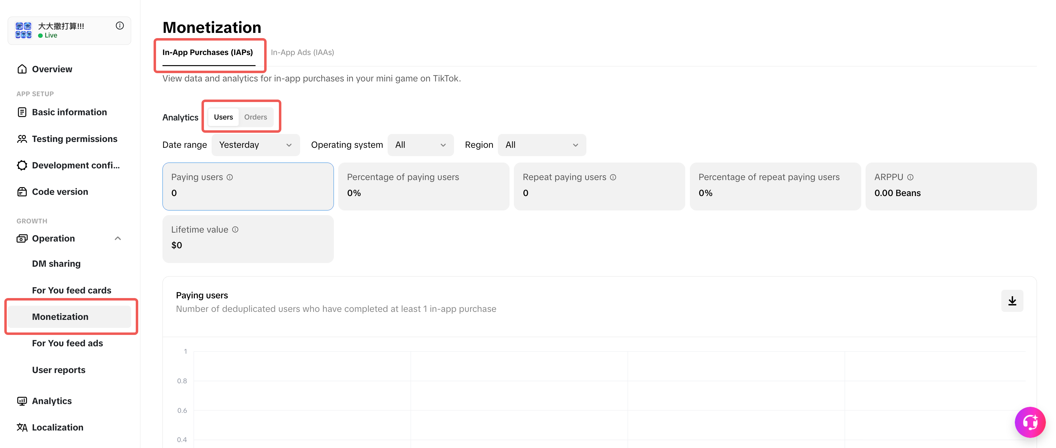 Data for in-app purchases (IAPs) and in-app ads (IAAs) are available on your app's Monetization page. IAP analytics allow you to track both users and orders, while IAA analytics display metrics for overall ad performance.