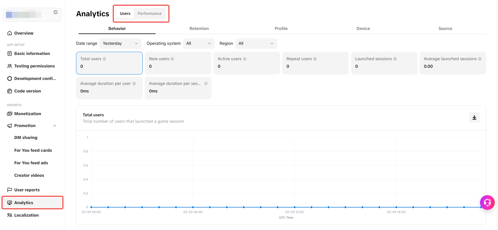 To find operational analytics on your app page, click the Analytics tab on the sidebar. Then make sure the toggle is set to your desired data type: Users or Performance.