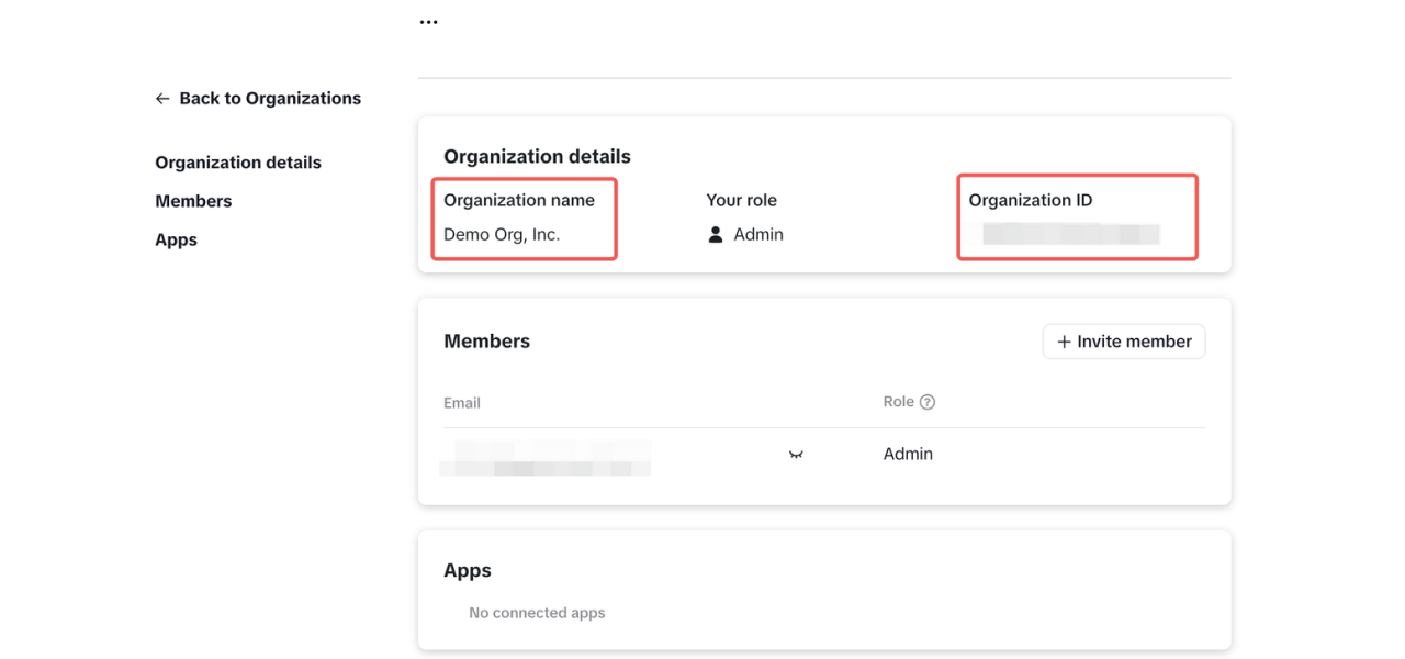 Find your Organization name and Organization ID in the organization details page. Click the Invite member button to invite contributing developers, so they can work collaboratively on your organization's apps.