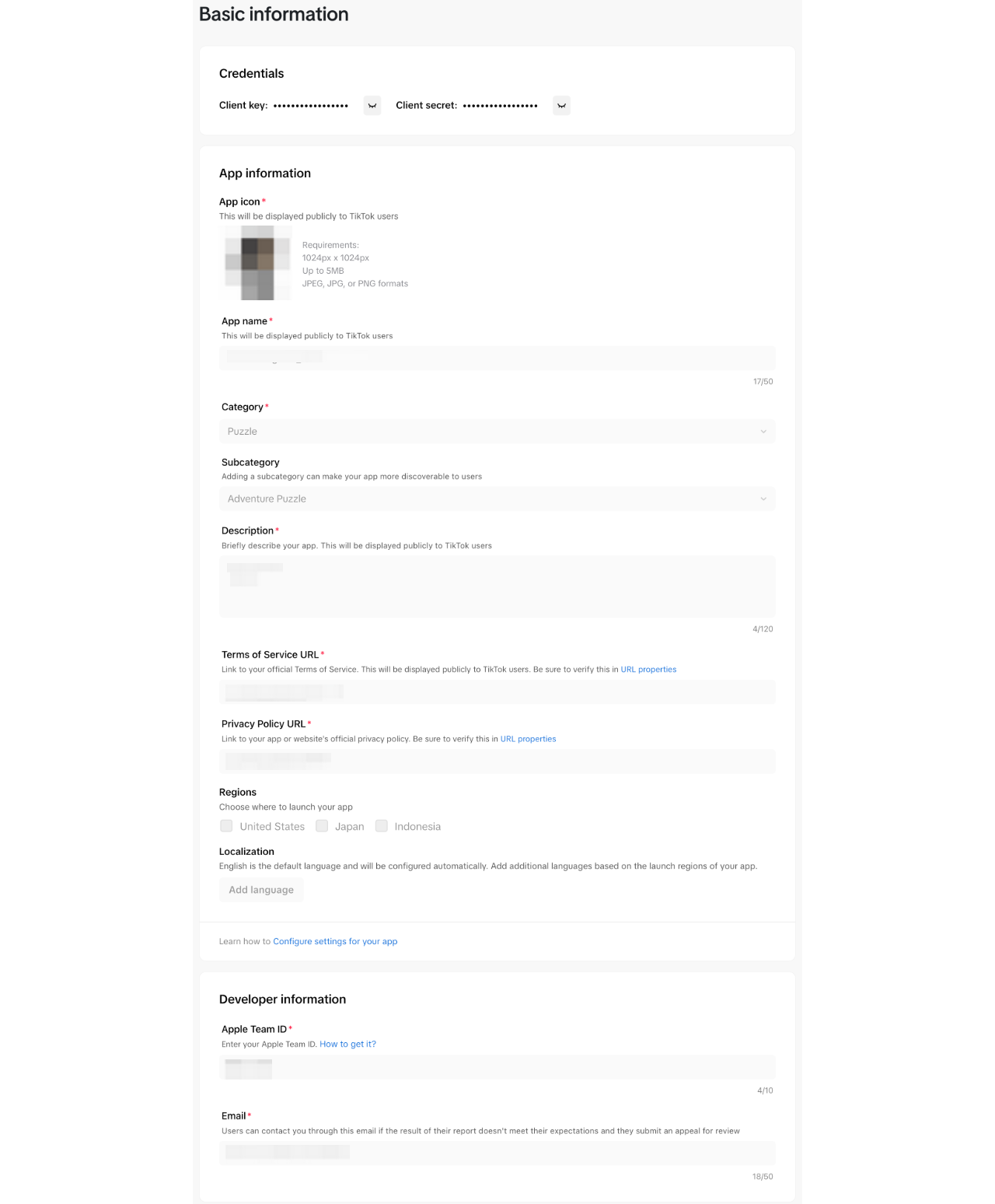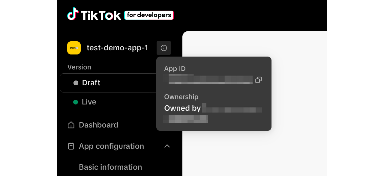 Provide your App ID, Client key, Client secret, Organization name, and Organization ID to your point of contact at TikTok to access mini game and monetization configurations on your TikTok for Developers app page. This may take up to 24 hours to process.