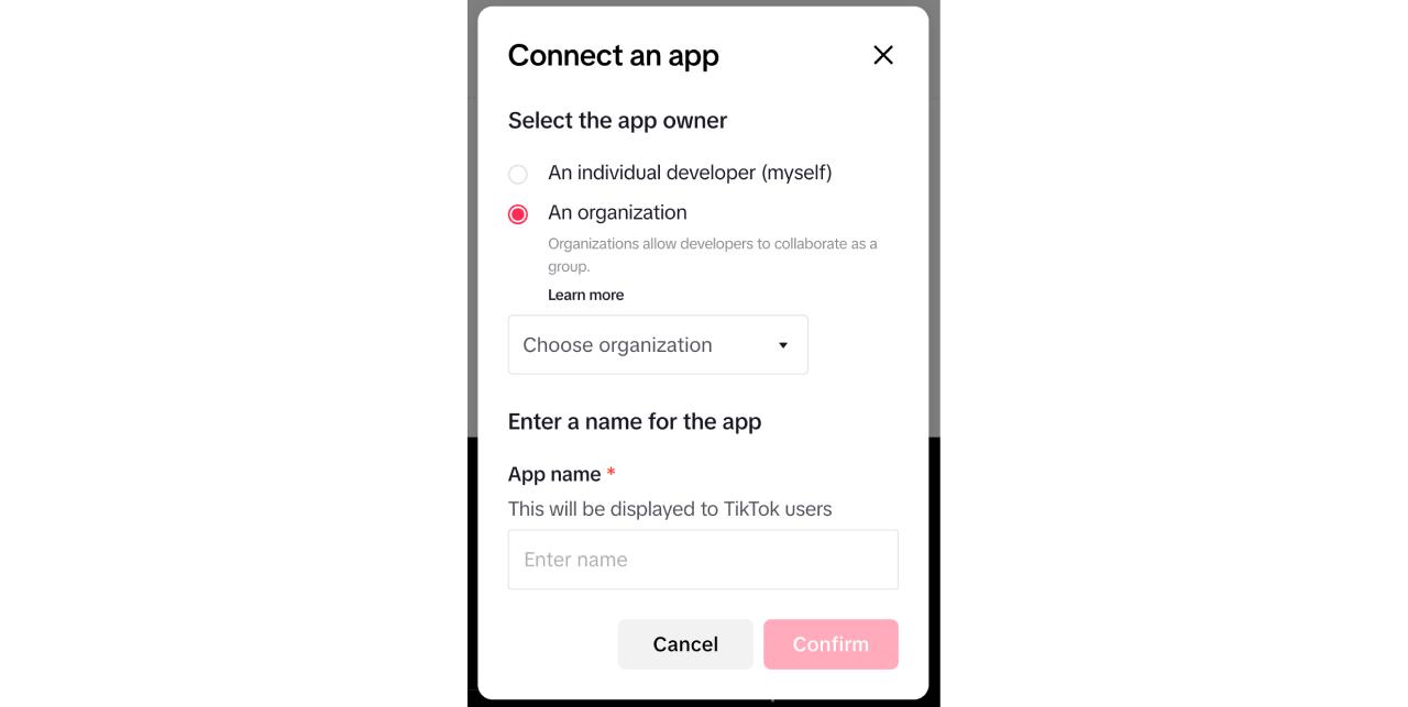 Enter a name for your organization. Your organization name will be displayed to end users on TikTok, and should therefore represent the full name of your corporate entity. The organization name cannot be modified after you've created the organization.
