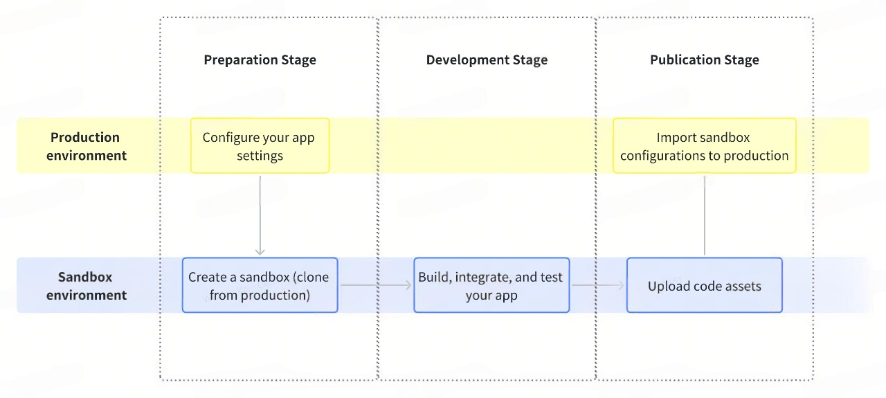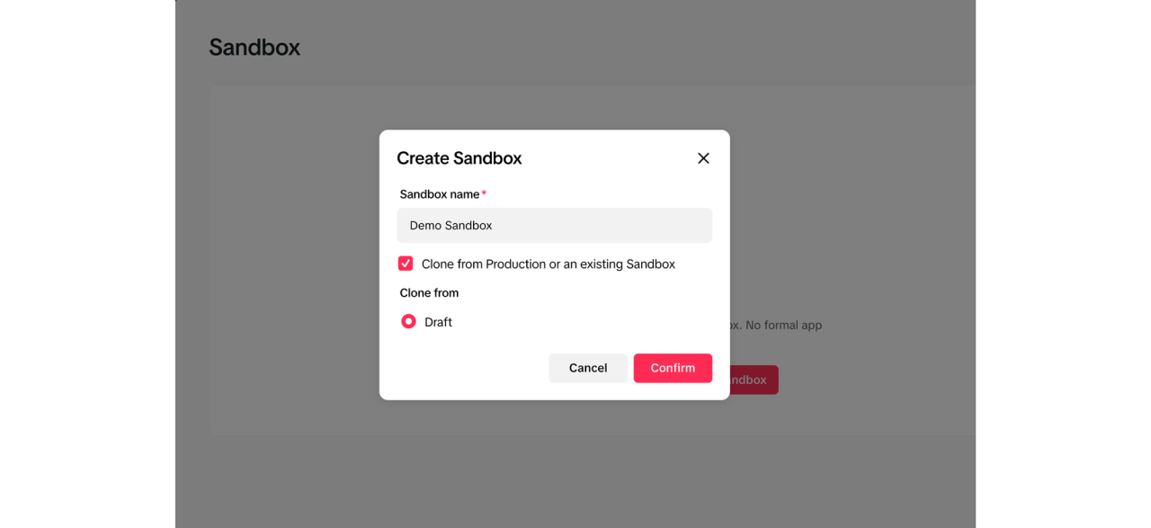 To add a sandbox, go to the Sandbox section on your app page and click Create Sandbox. Make sure to clone your new sandbox from production, so your app configurations entered in the previous step will copy over.