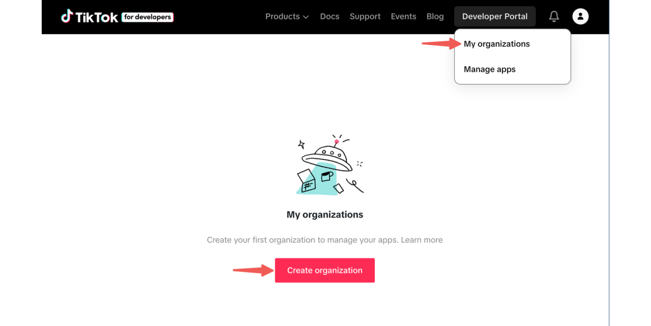 Organizations allow multiple developers to work collaboratively on apps registered with TikTok for Developers. Create an organization on the Developer Portal to represent your corporate entity and manage contributing developers.