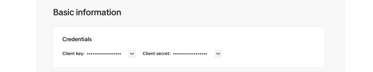 To view your app's Client key and Client secret, go to the Credentials section under Basic information and click the eye icon.