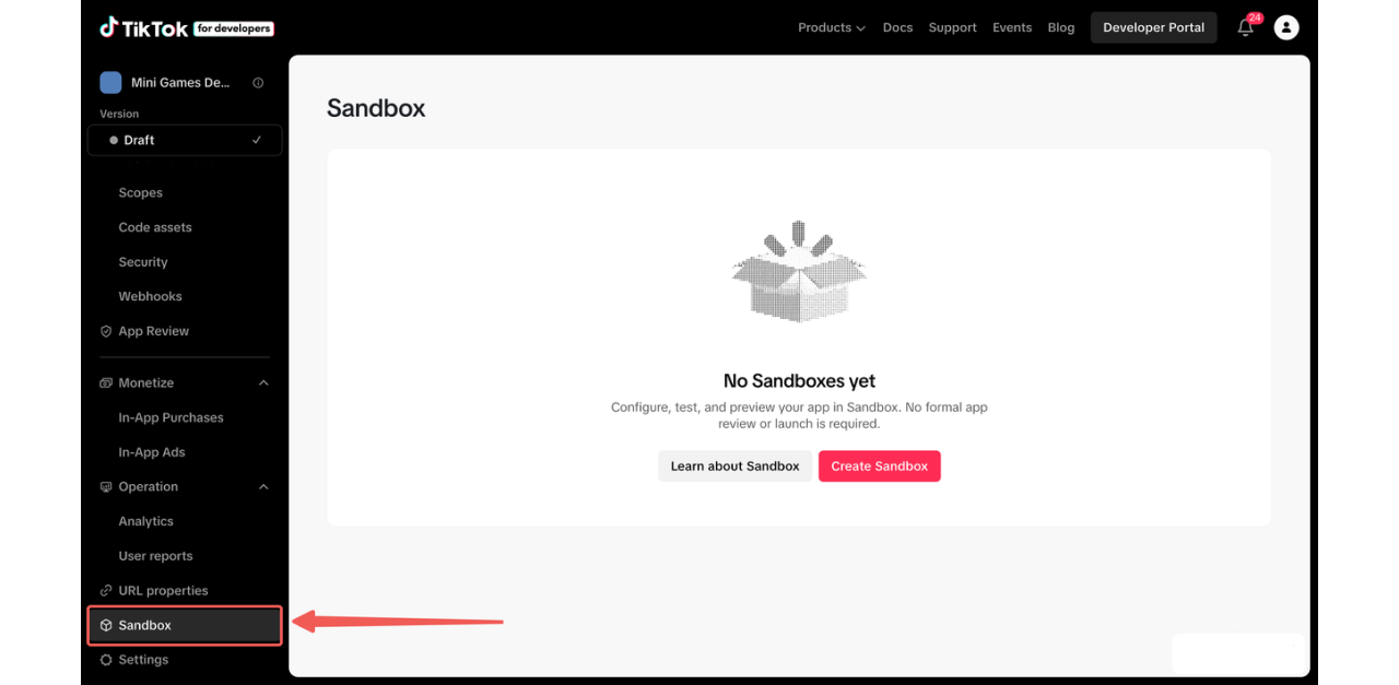 To obtain access to mini game configurations on the Developer Portal, you must first register your app on the TikTok for Developers website and provide relevant information to your point of contact at TikTok. After receiving access, you may set up a sandbox environment for testing later on.