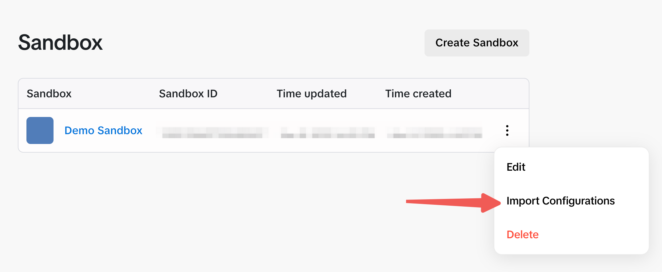 In the Sandbox section of your app page, click the More options button next to the desired sandbox. Click Import Configurations to overwrite the existing configurations of the draft version with your sandbox configurations.