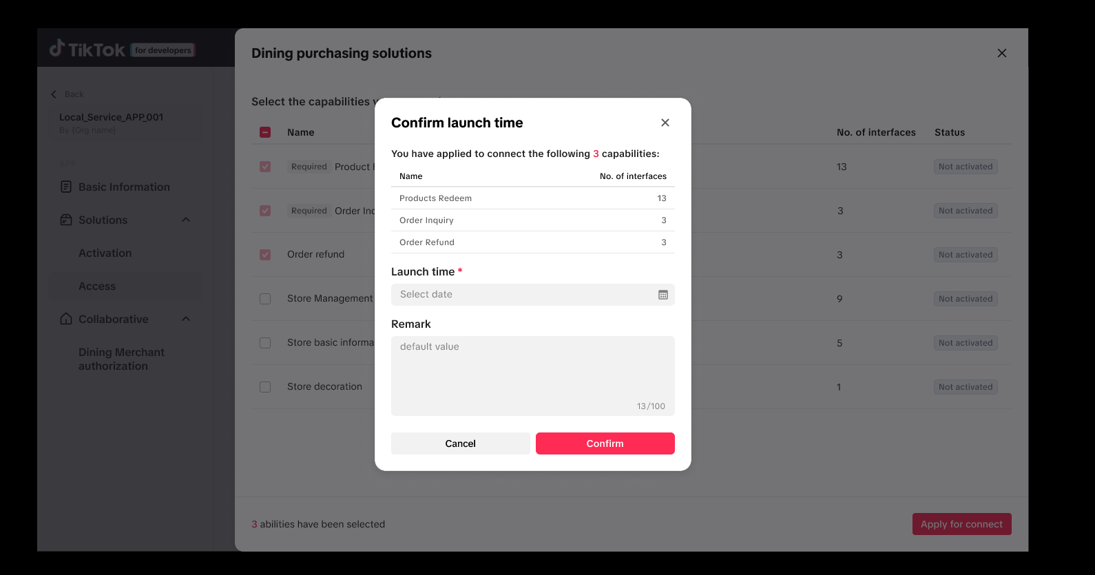 After your solution activation application has been approved, you must connect to TikTok's relevant webhooks. First set a launch time for when you want to start using the requested capabilities.