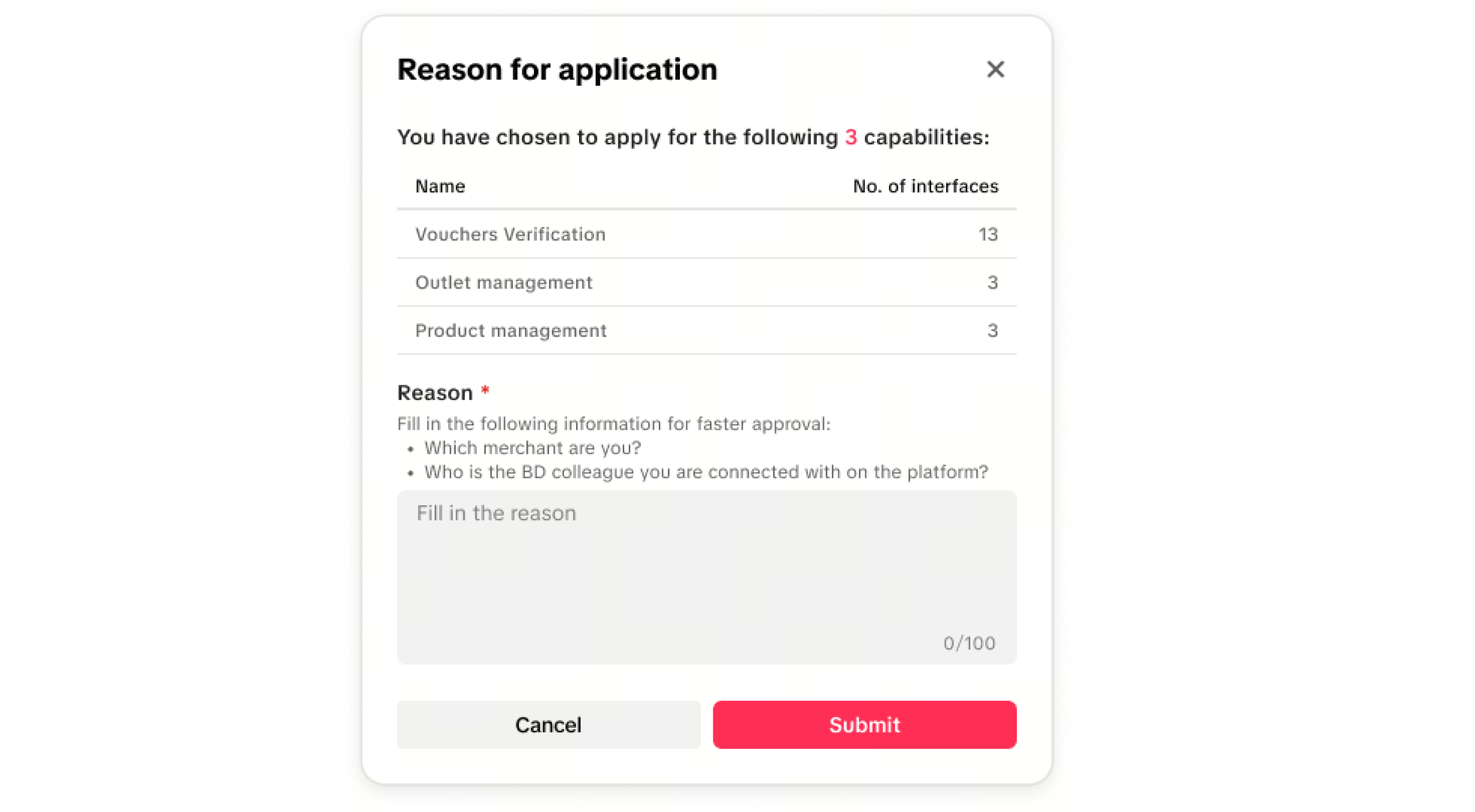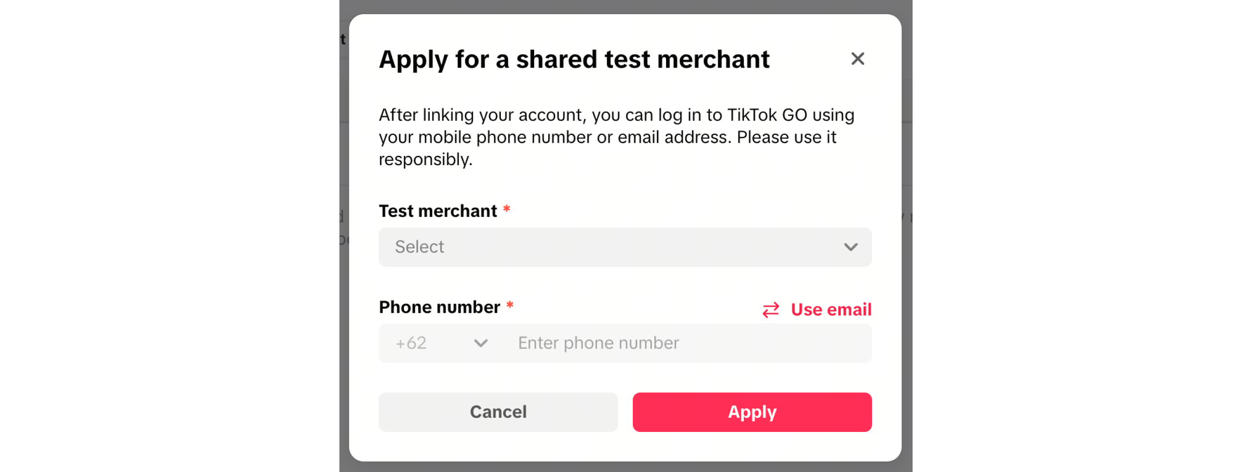 - Fill in the reason for your application. You must include the name of your merchant and the full name of your business development colleague at TikTok.