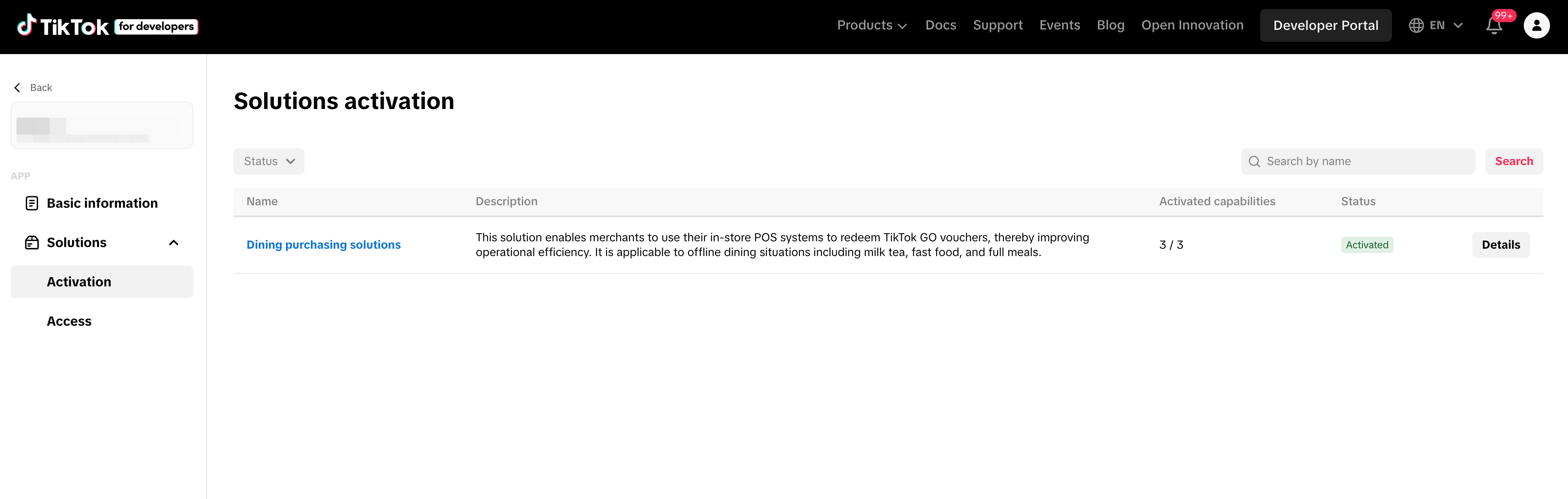 Go to the Activation page, located under Solutions on the sidebar of your app page. Each solution listed has multiple capabilities that you can select.