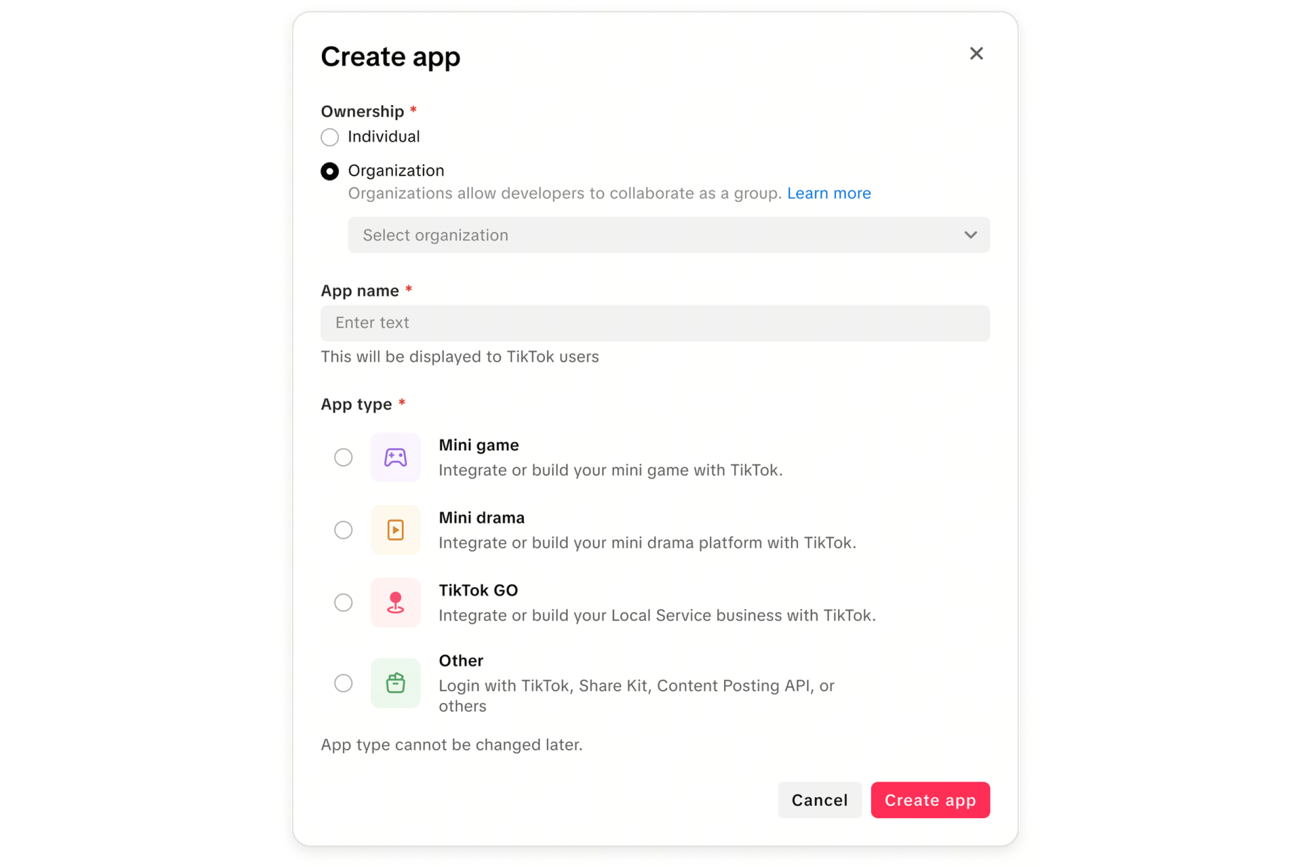 Important: Once you've created your organization, please inform your business development (BD) partner at TikTok that you intend to also create an app on the Developer Portal.