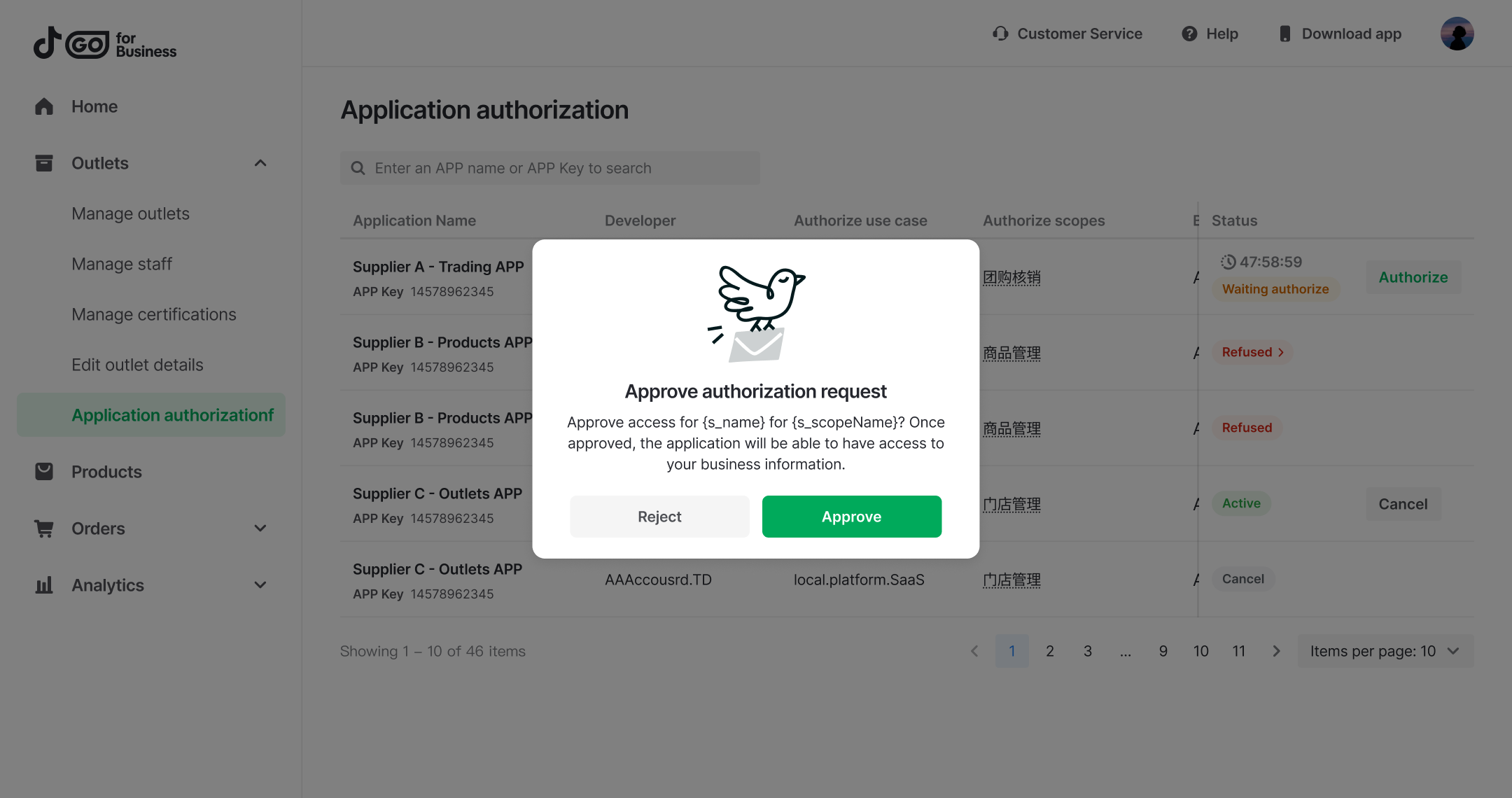 Create an app in the Developer Portal that represents your service. You will use this app to register information and activate business solutions.