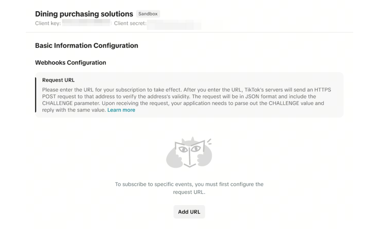 Next, you must configure webhooks. TikTok currently offers six webhooks to merchants. Connect to all of the necessary webhooks by providing a callback URL.