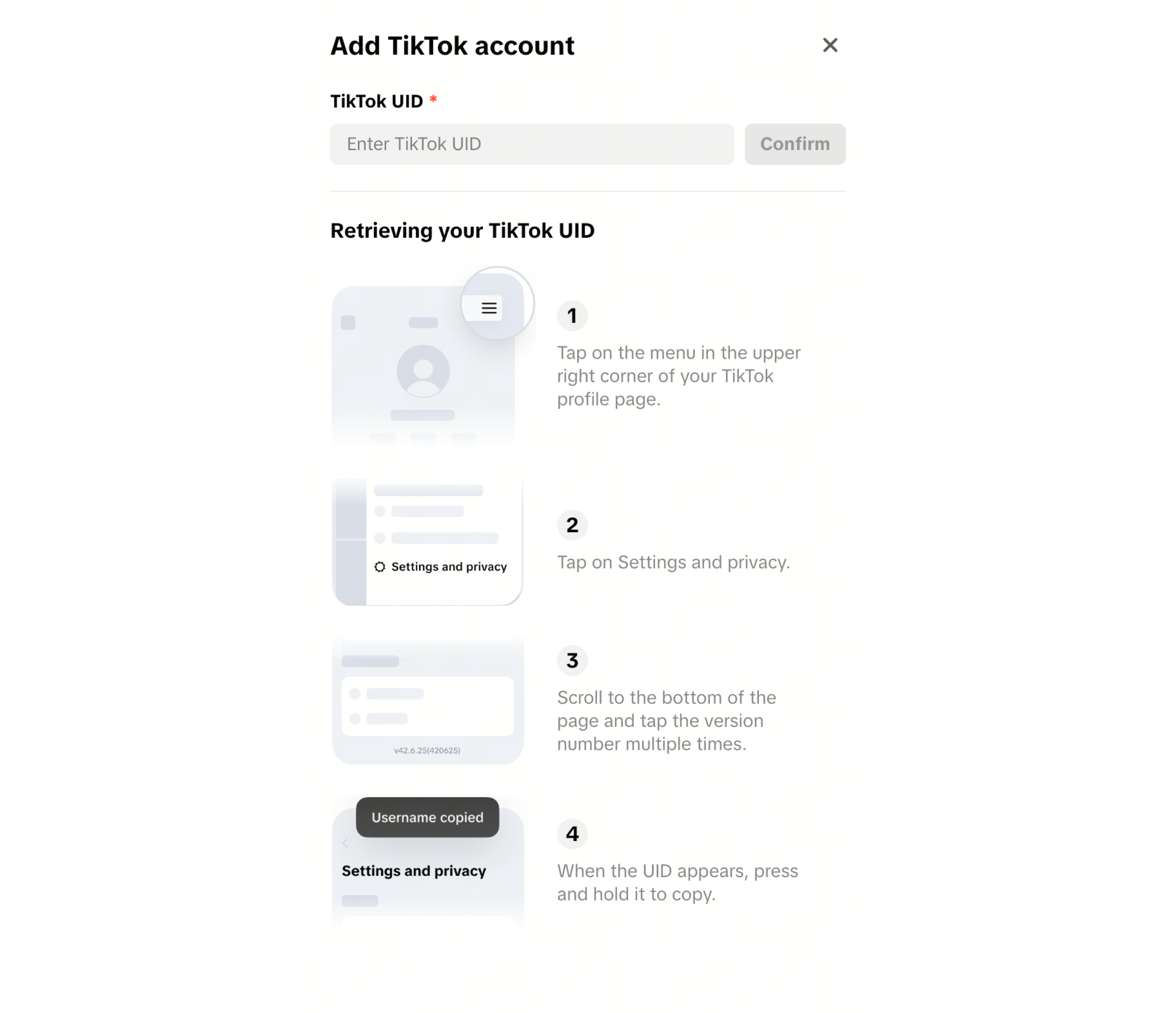 - Enter TikTok account's UID, then click the Confirm button.