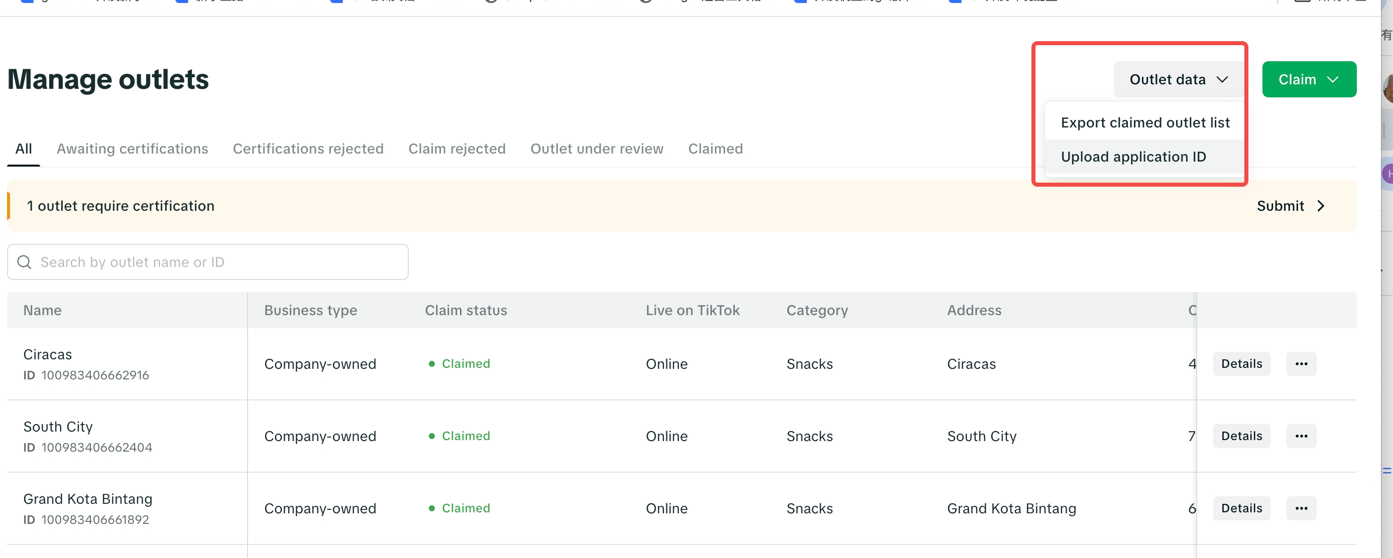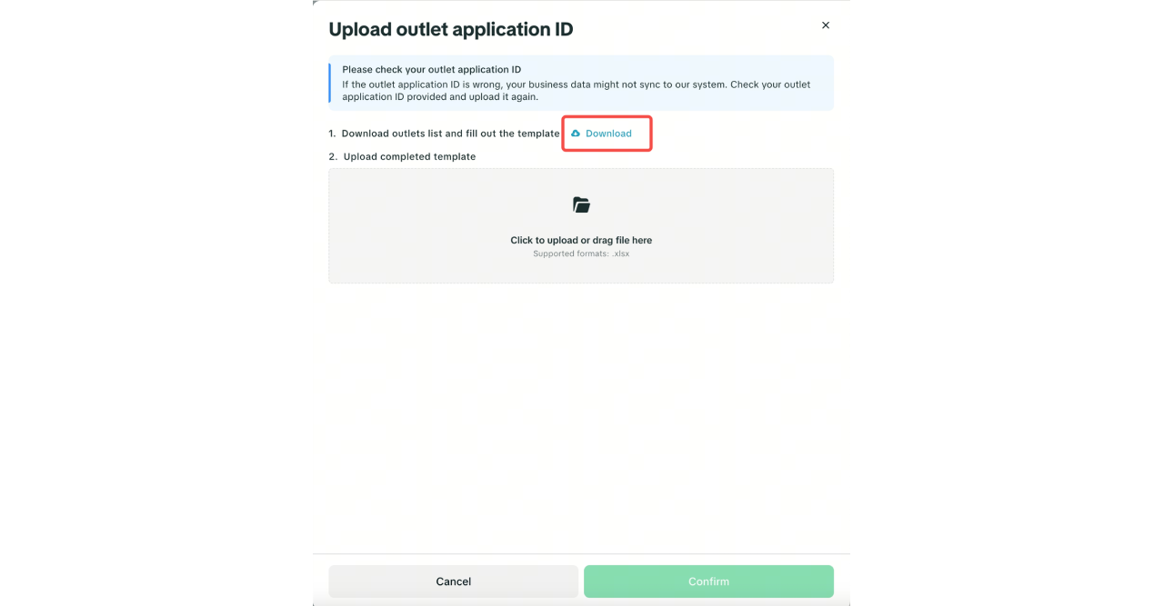 - Under the Manage Outlets tab, click the Outlet data dropdown, then click Upload application ID.