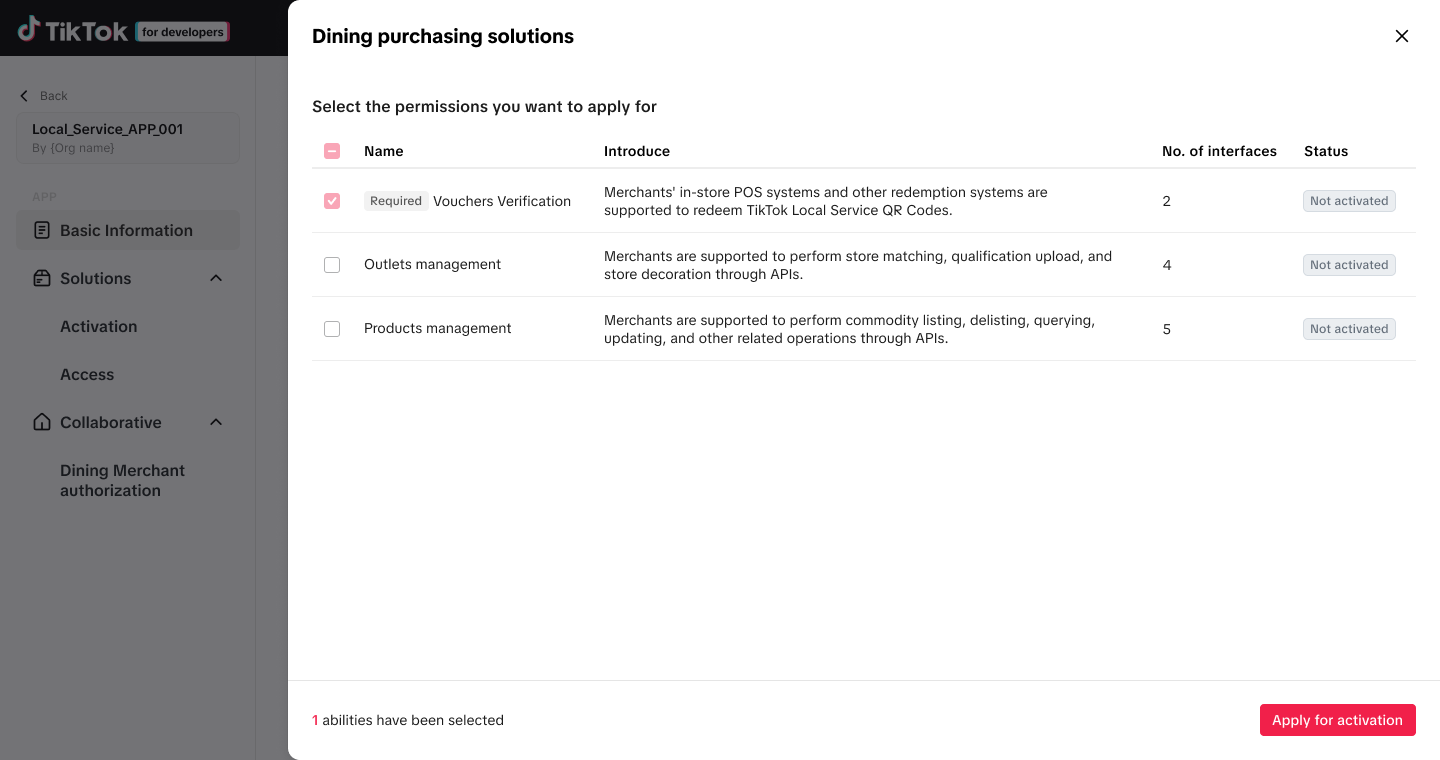 - Select the capabilities you want to integrate, then click the Apply for access button.