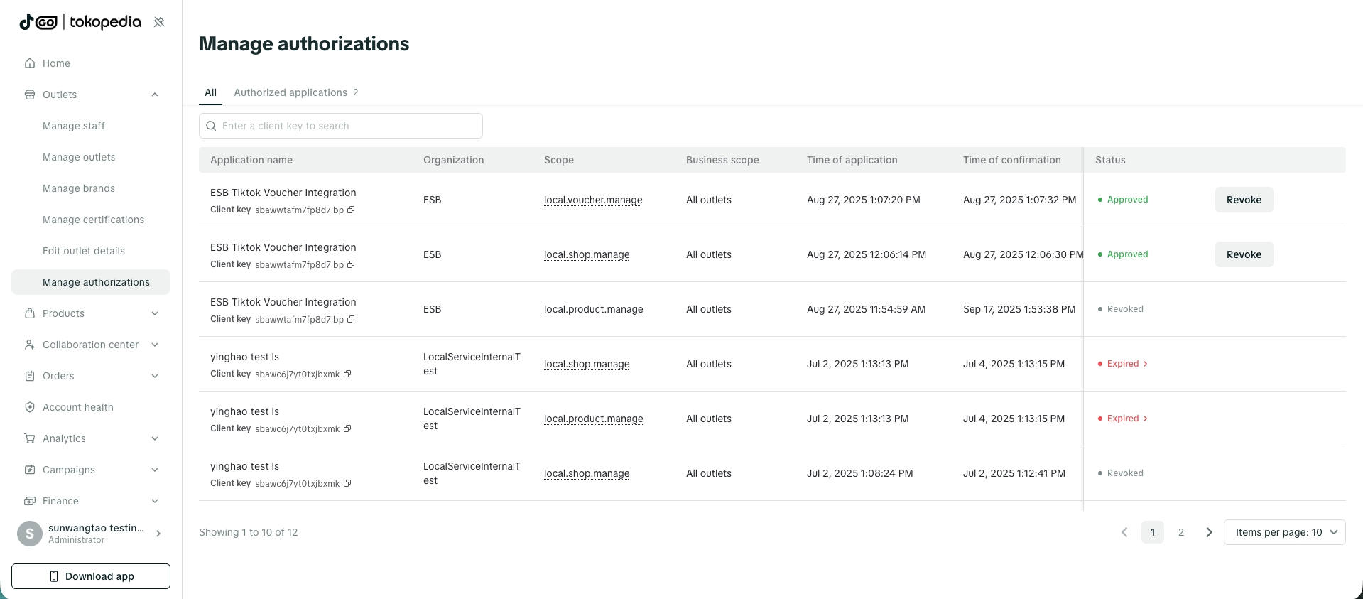 - Click the Authorize button next to the application from your test merchant. Click the Accept button to approve this test merchant.