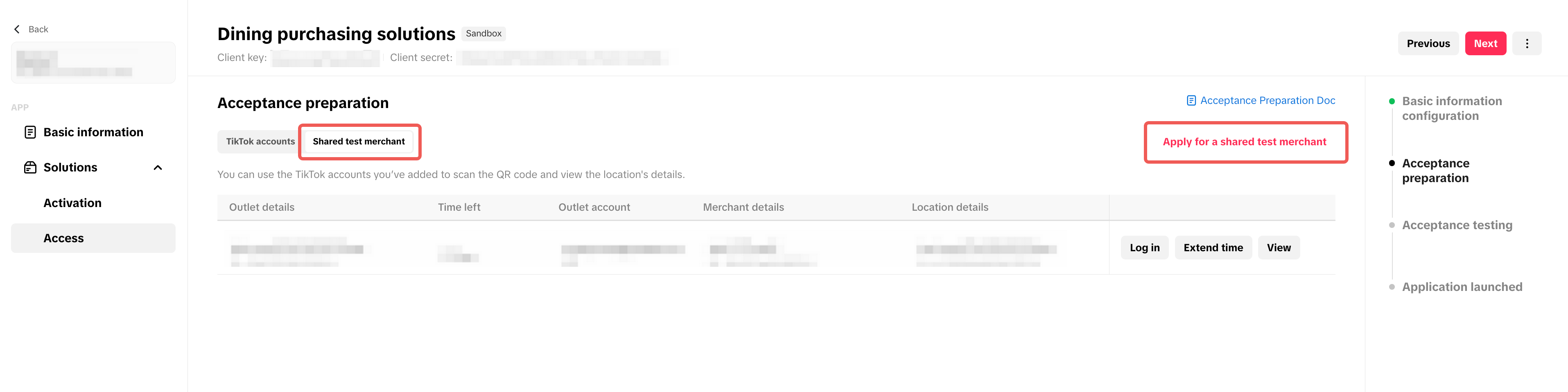 - Switch the toggle on the Acceptance preparation page to Shared test merchant.
