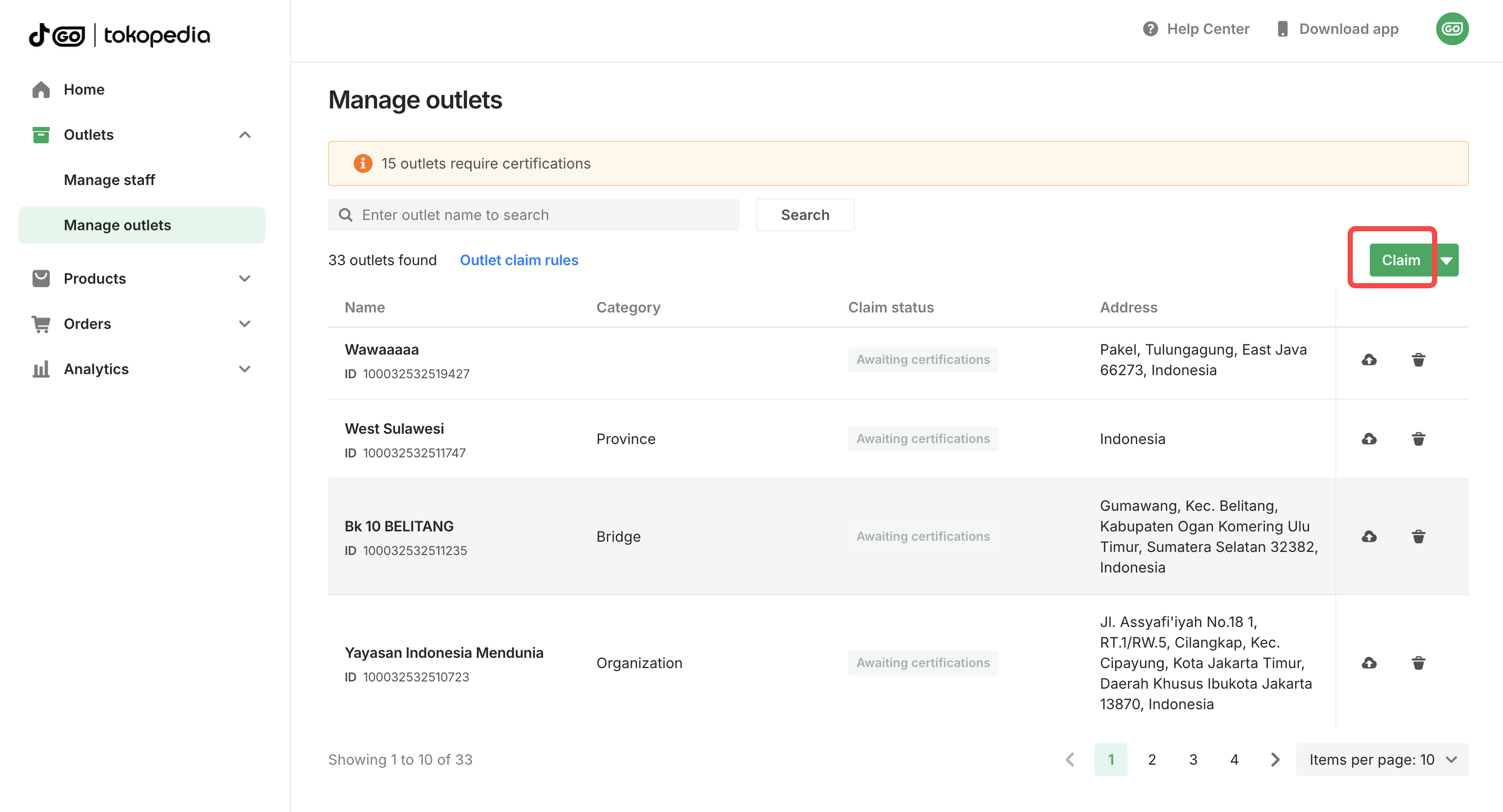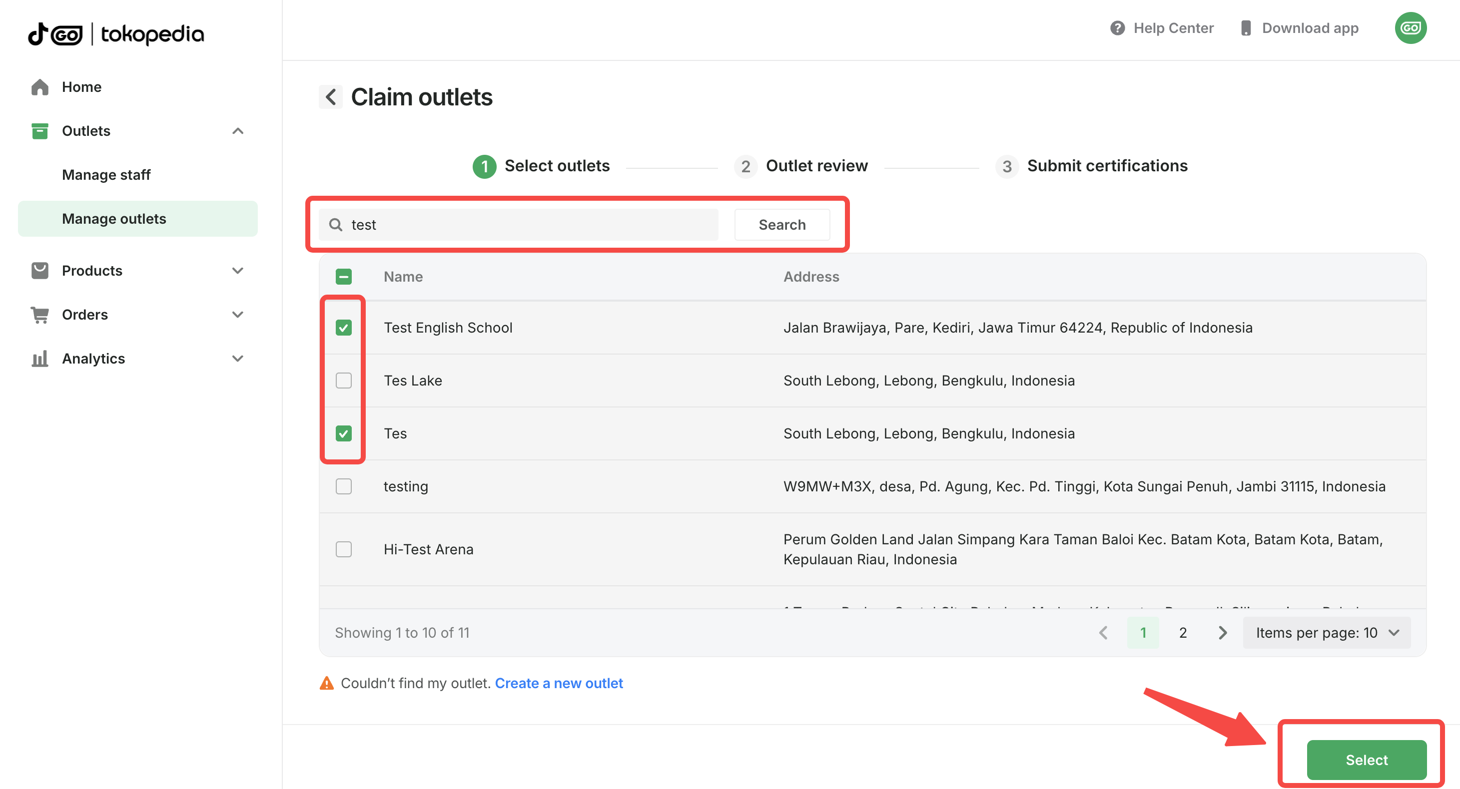 - Select the outlets you want to claim from the list. You can select one or more outlets (up to 50 outlets per batch).