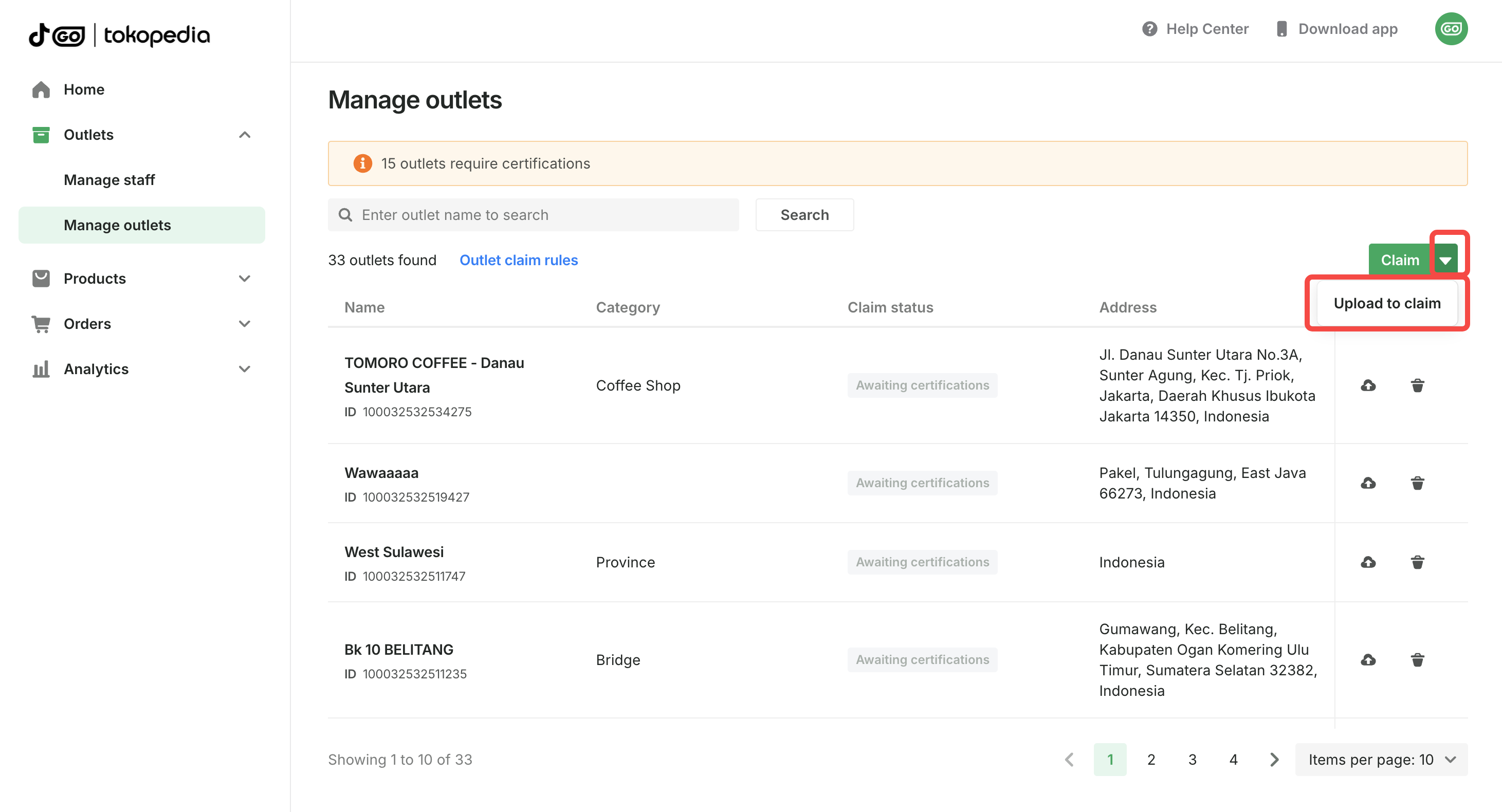 - On the Manage outlets page, click the dropdown next to the Claim button. Click Upload to claim.