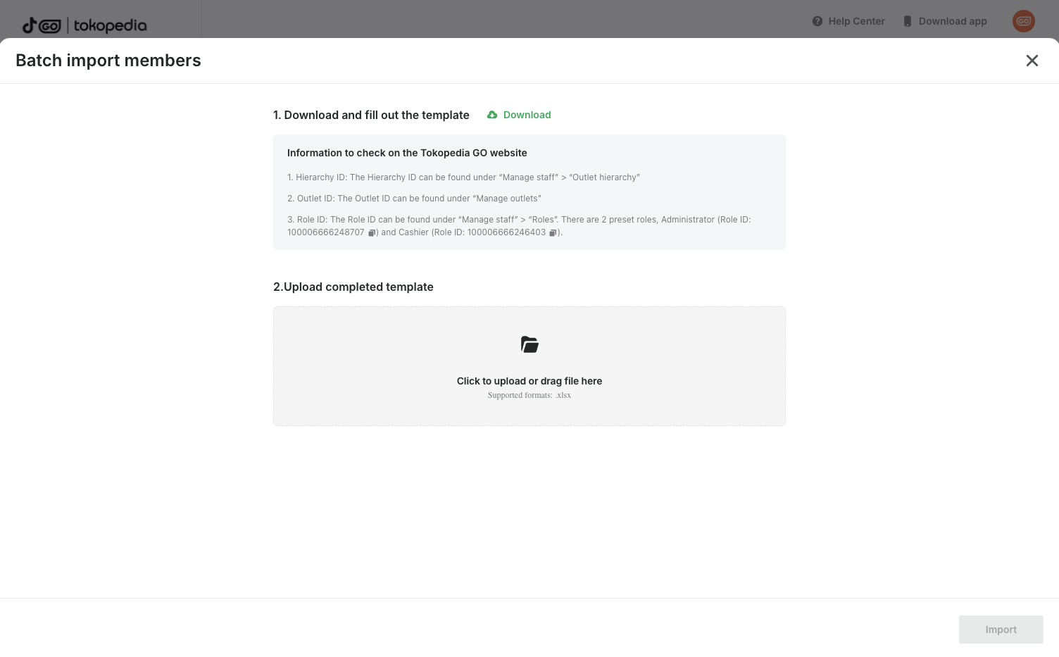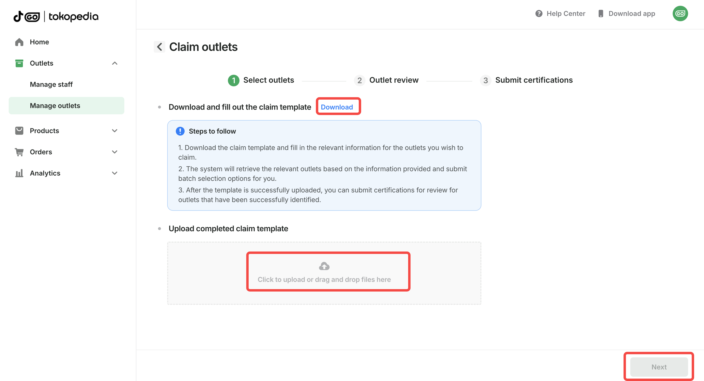 - After filling in the outlet information required for the template, upload the completed form on this page.