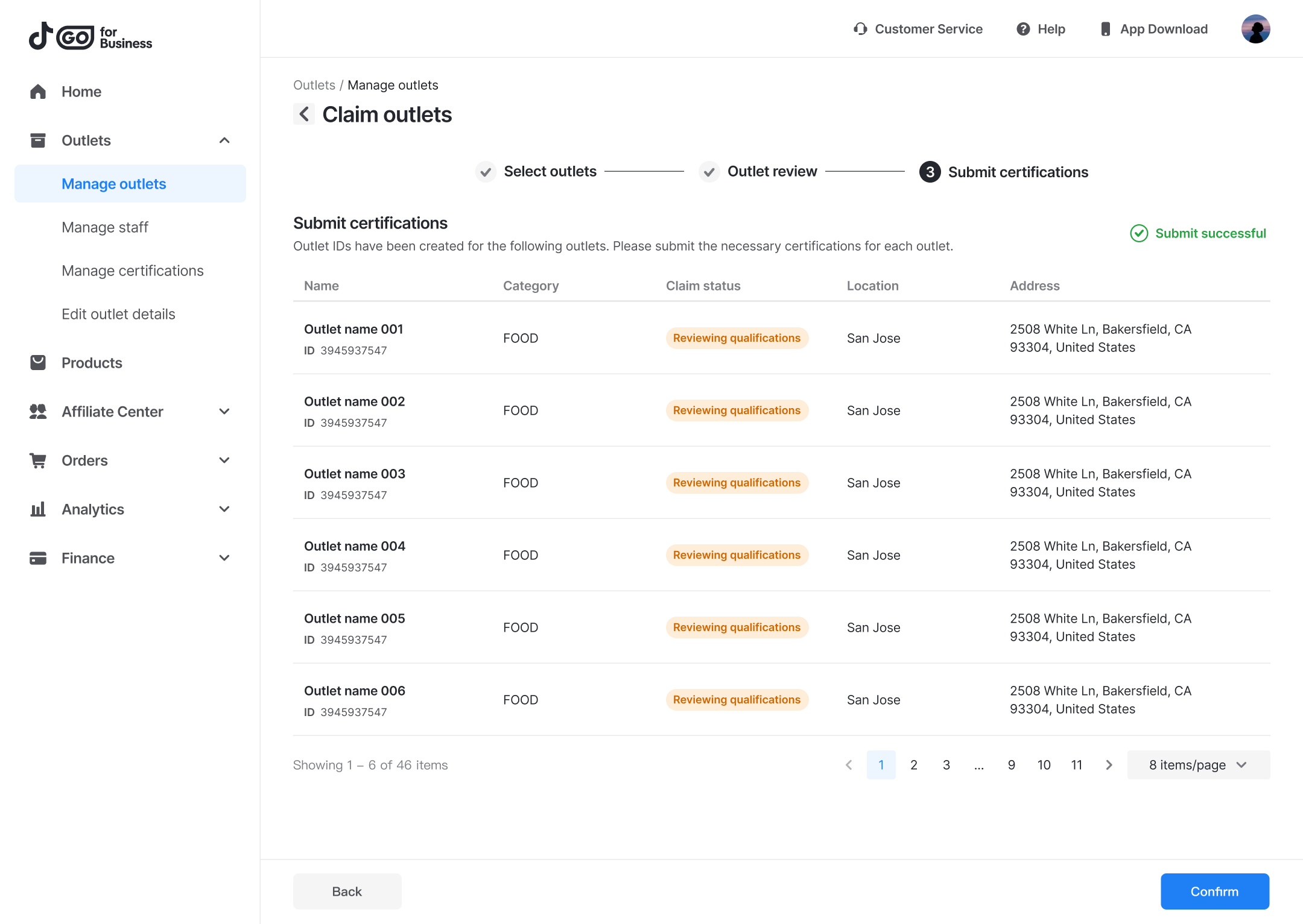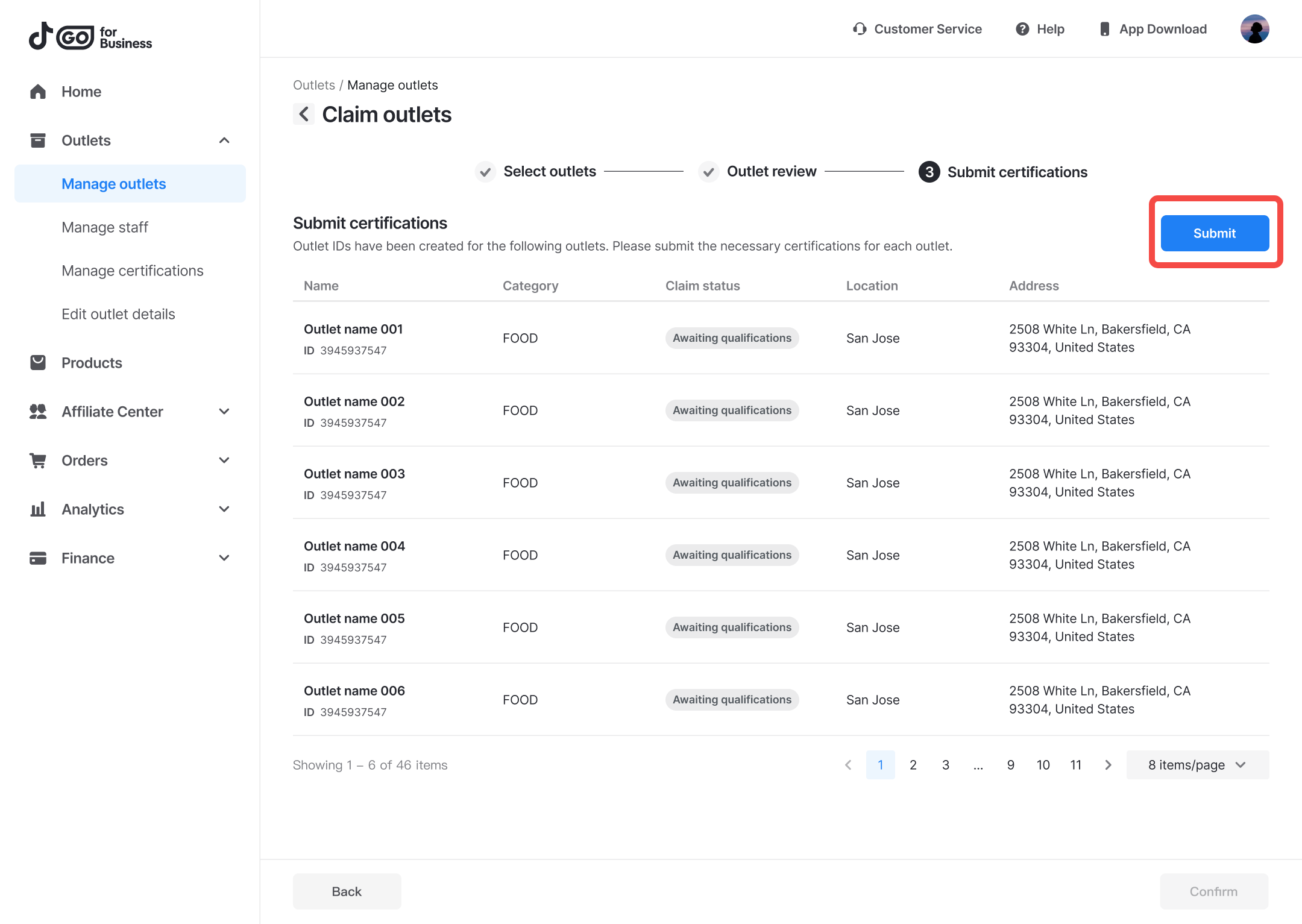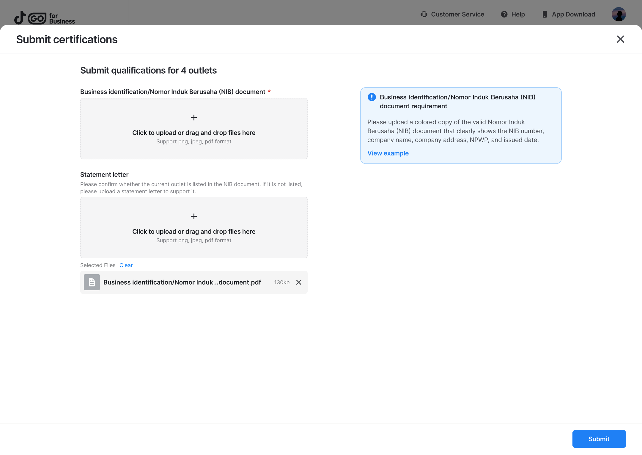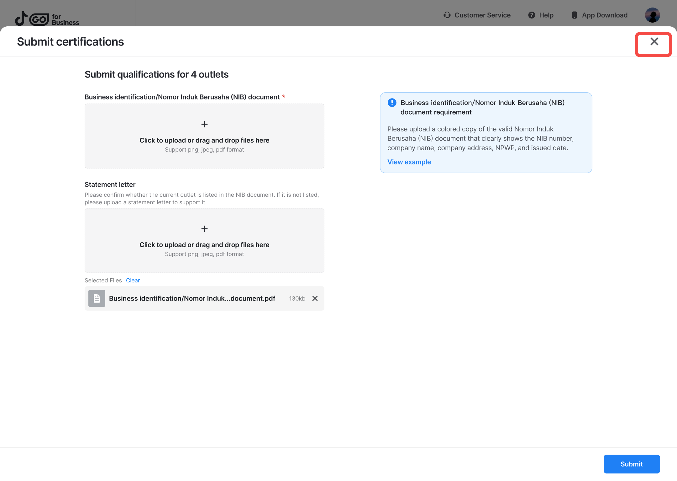 - If you want to upload qualifications later, you can close the window. You can find outlets awaiting qualifications on the Manage outlets page, and click Batch submit to submit qualifications in batches.