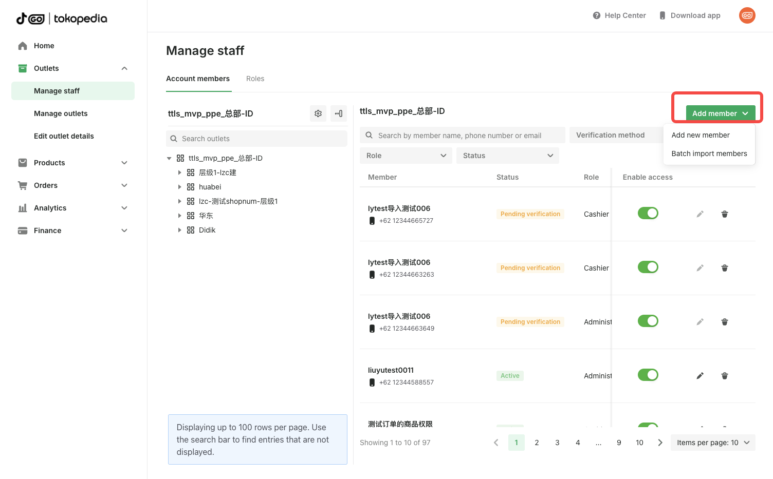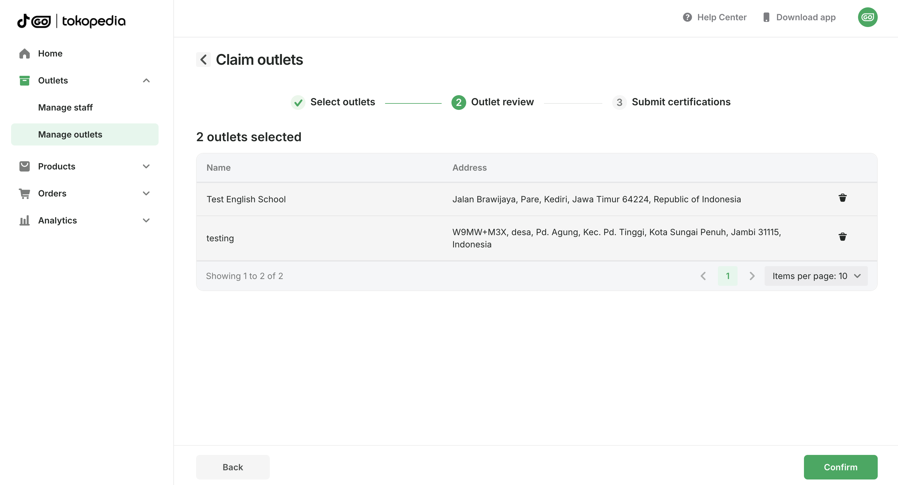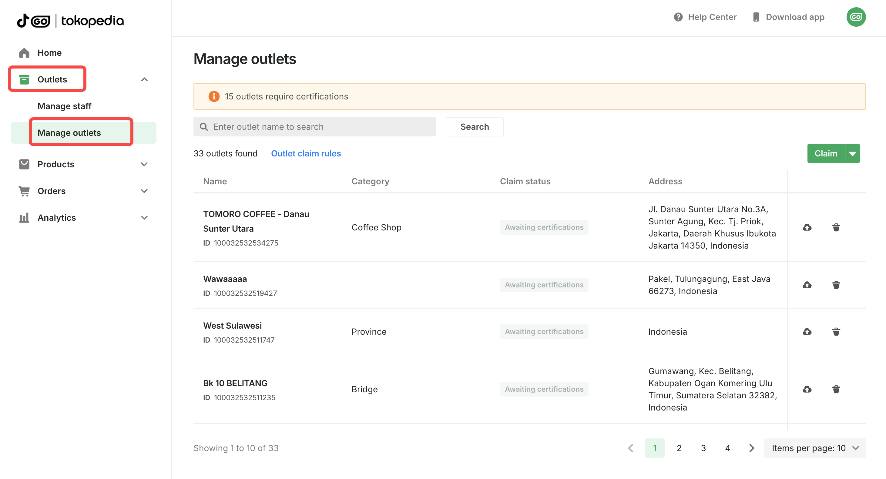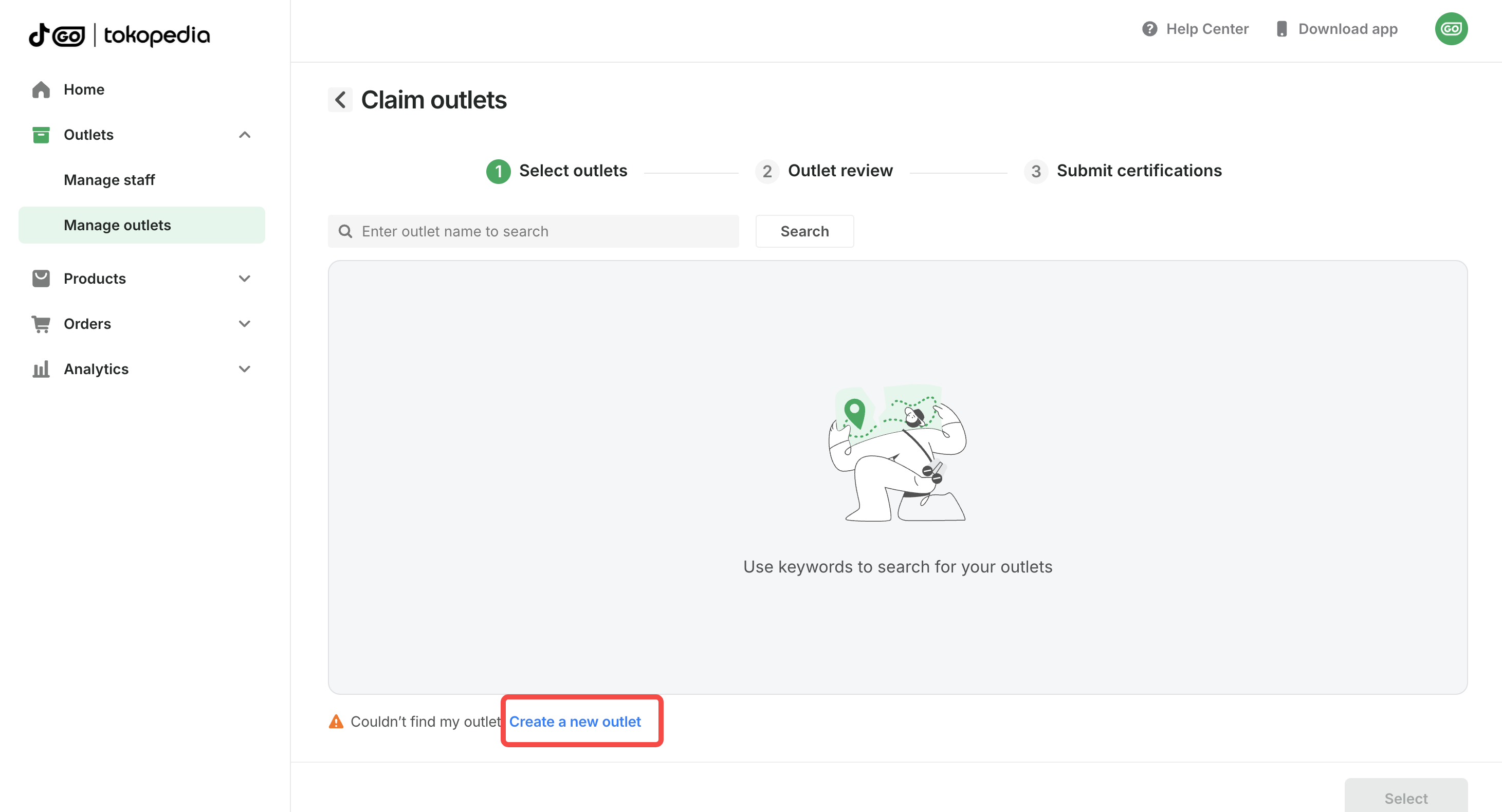 If your outlet exists within Tokopedia's system, you can search for it. On the Manage outlets page: