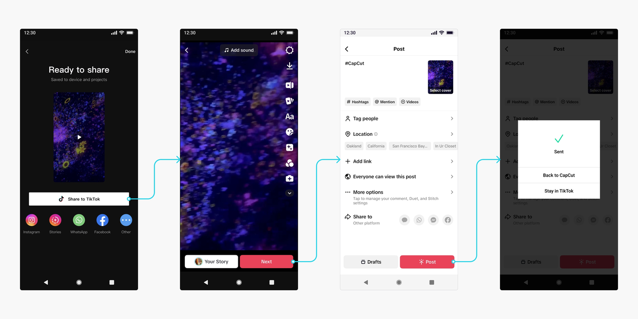 - Include your app's hashtag in content shared to TikTok. By engaging with the TikTok SDK, third party platforms will not only provide a new channel for their users to share their creations, but also expand the reach of their own platform through specified partner hashtags, as shown in the user journey below.