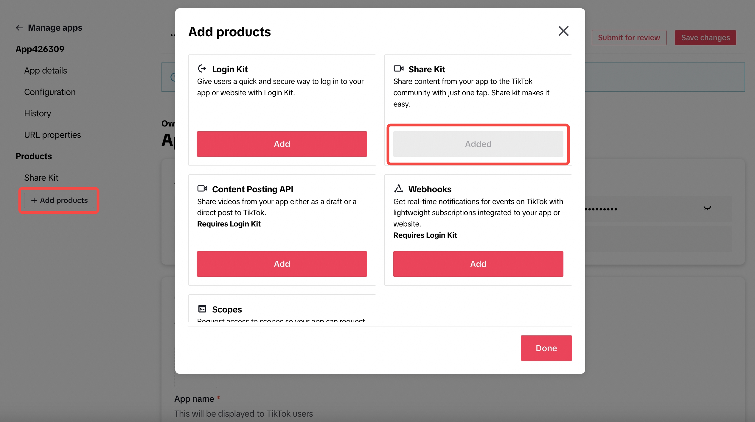 Obtain the client_key located in the Appdetails section of your app on the TikTok for Developers website. Then add Share Kit to your app by navigating to the Manage apps page, and clicking + Add products.