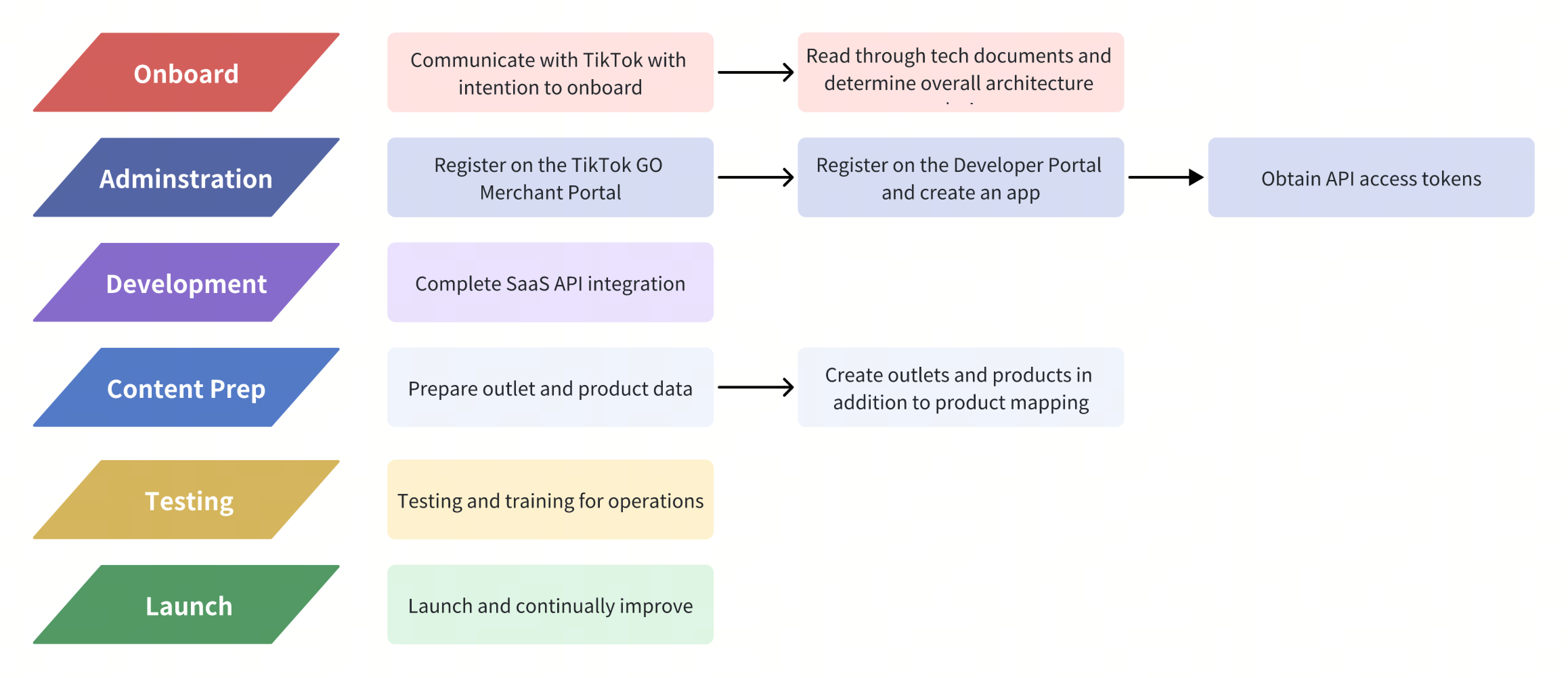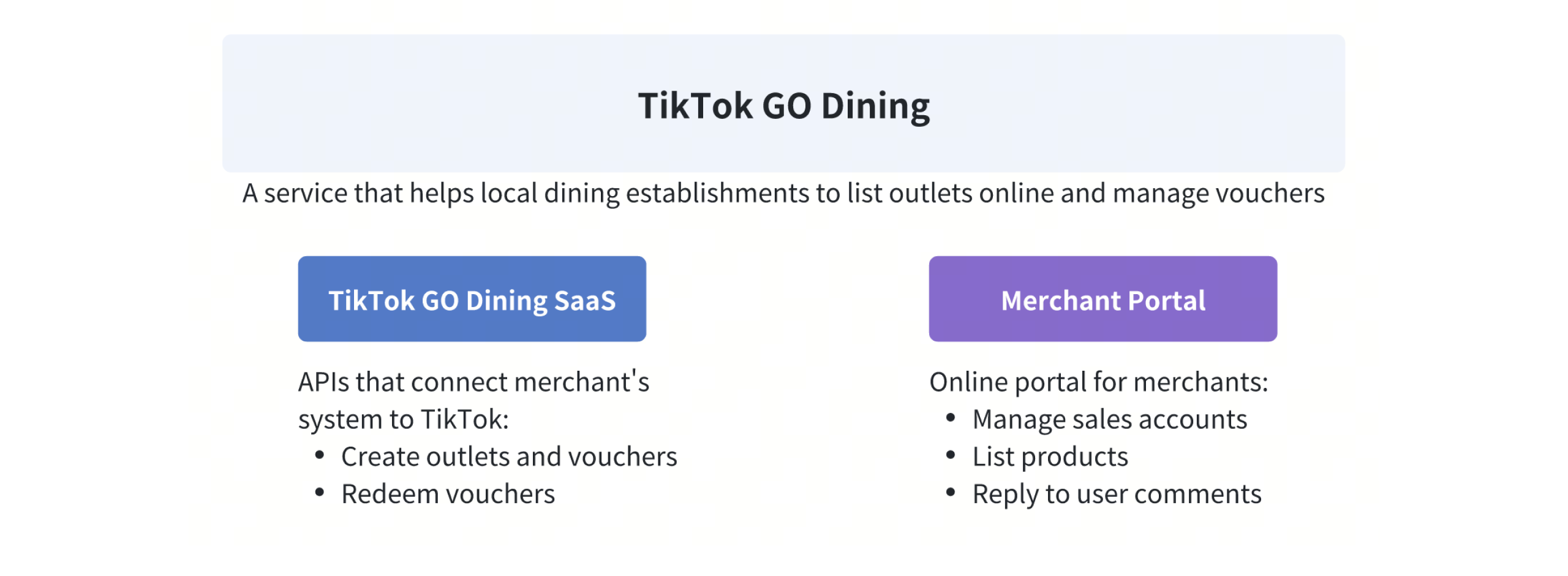 - TikTok GO Dining SaaS: APIs that connect the merchant's system to TikTok, enabling seamless integration in creation of outlets and vouchers as well as voucher redemption. These are accessed through the Developer Portal on the TikTok for Developers website.