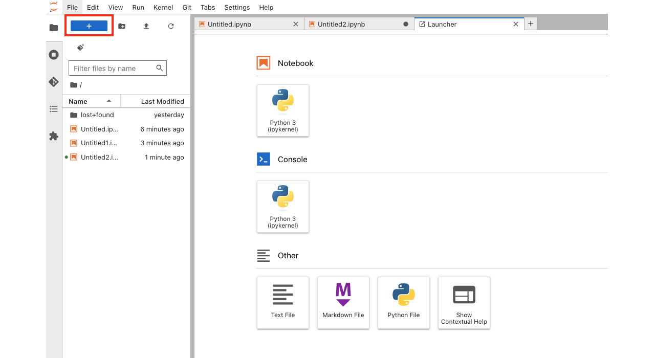 After logging into the VCE, click the New Launcher [+] button. Then open a new notebook, choosing the Python 3 (ipykernel) option.