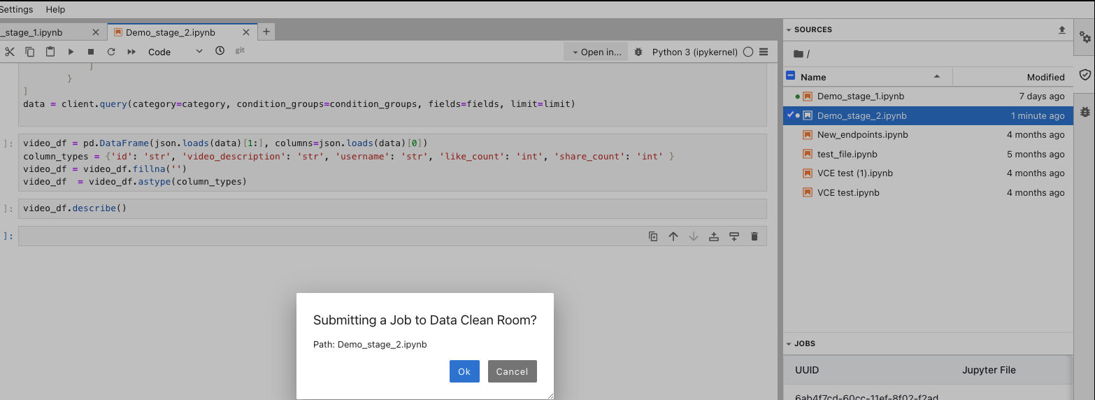 - When prompted to submit a job to Data Clean Room, click the Ok button.
