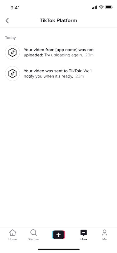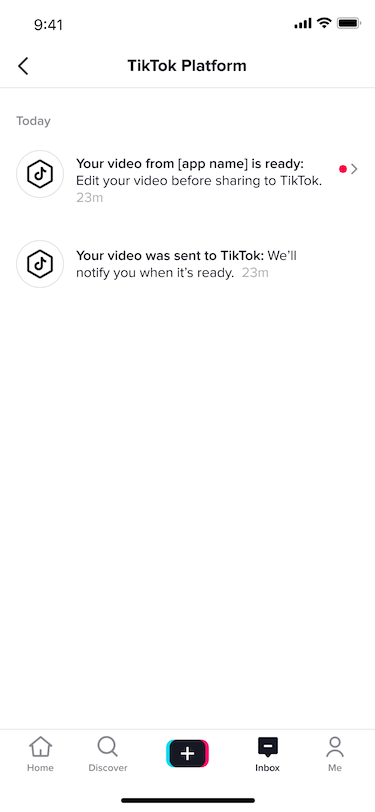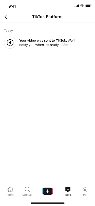 - After some time, another notification will appear in your inbox saying: "Your video from <APP> is ready: Edit your video before sharing to TikTok." Click this notification to proceed to edit and publish your video to TikTok. You may instead get another notification explaining that your video upload has failed. If this occurs, please check that your video meets the constraints outlined in the "Constraints" section above in this documentation and try uploading your video again.