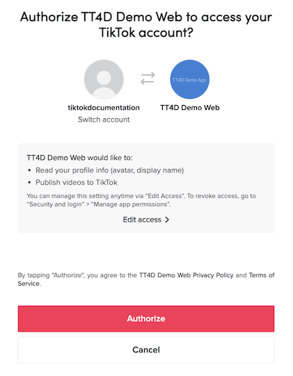 video.uploadpermissions to your application. This should be shown under the authorization page as a bullet that reads "Publish videos to TikTok".